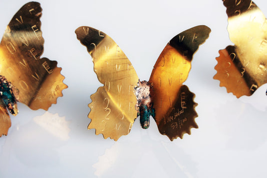 Introducing the Joy Holiday Collection - Brass Edition, an annual series featuring one hundred meticulously handcrafted butterfly sculpture Christmas ornaments. Crafted entirely from brass, each ornament is hand embossed with the word LOVE as a uniform pattern and bent to achieve the illusion of movement.