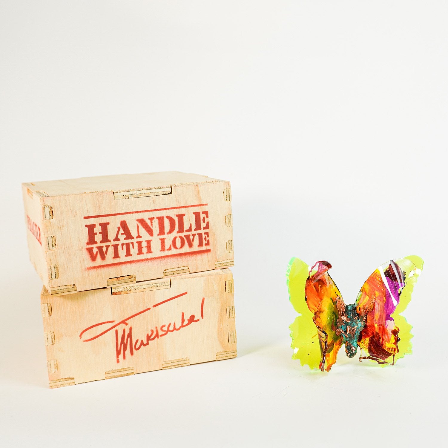 Ambar Joy is 3.5” x 3.5” Each piece is numbered, signed, and placed into a handmade wooden box with a label that reads, “Handle with Love.”
