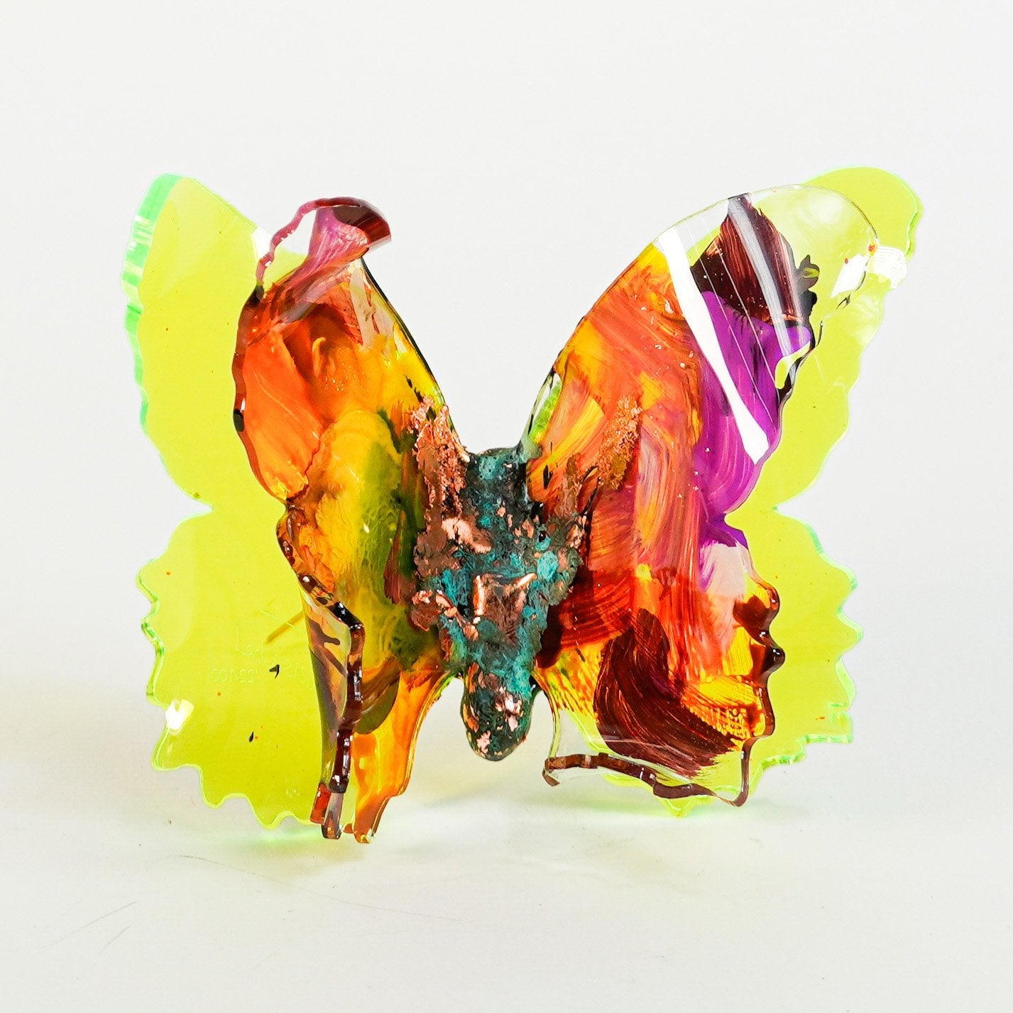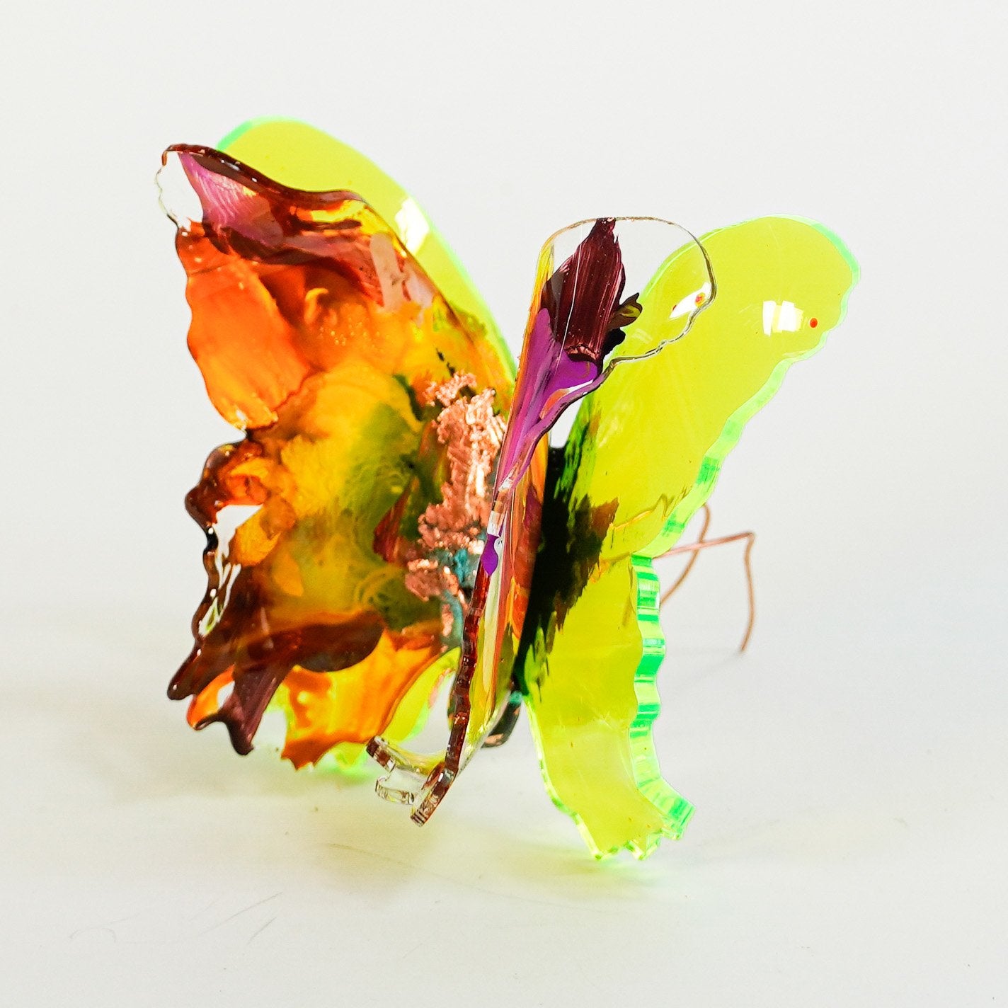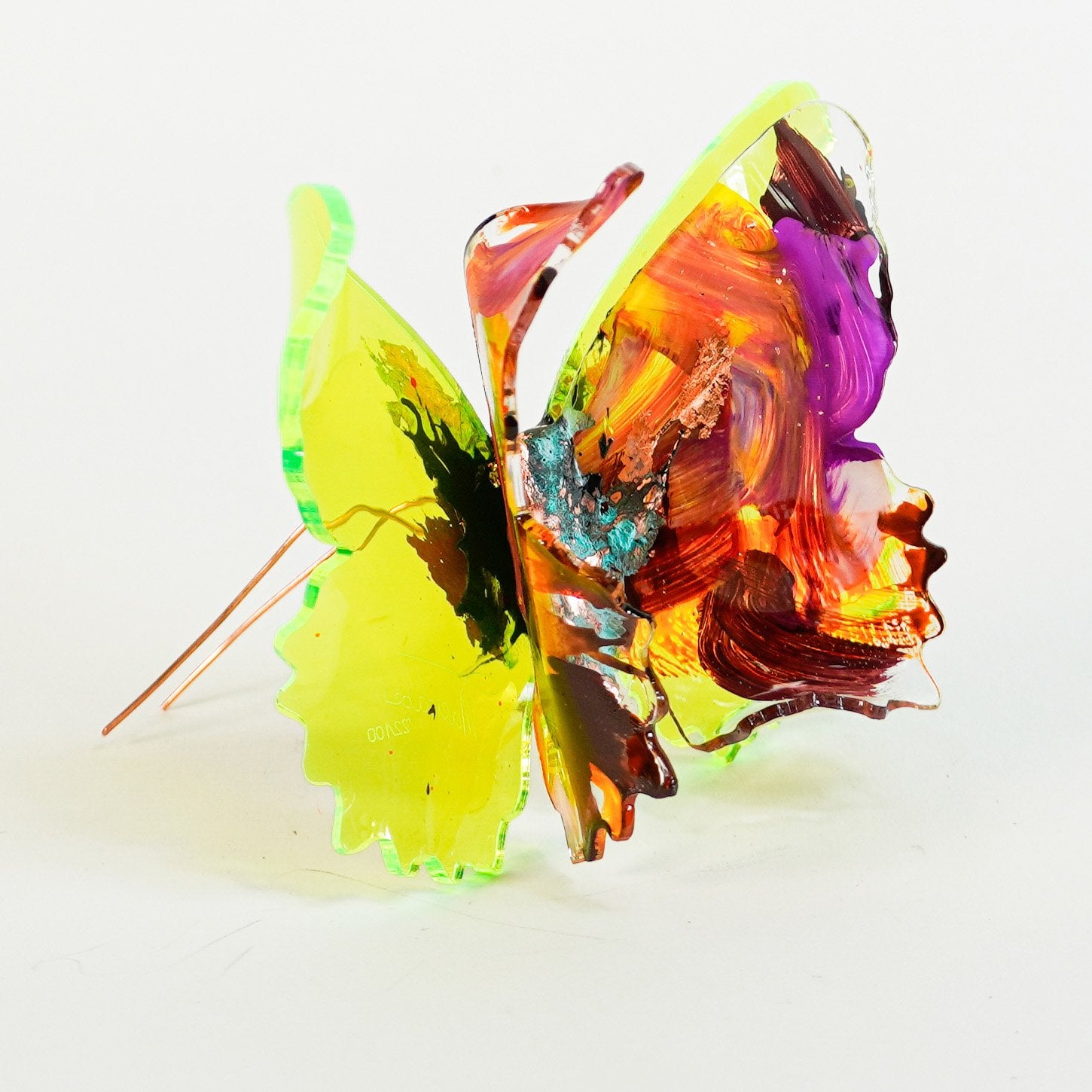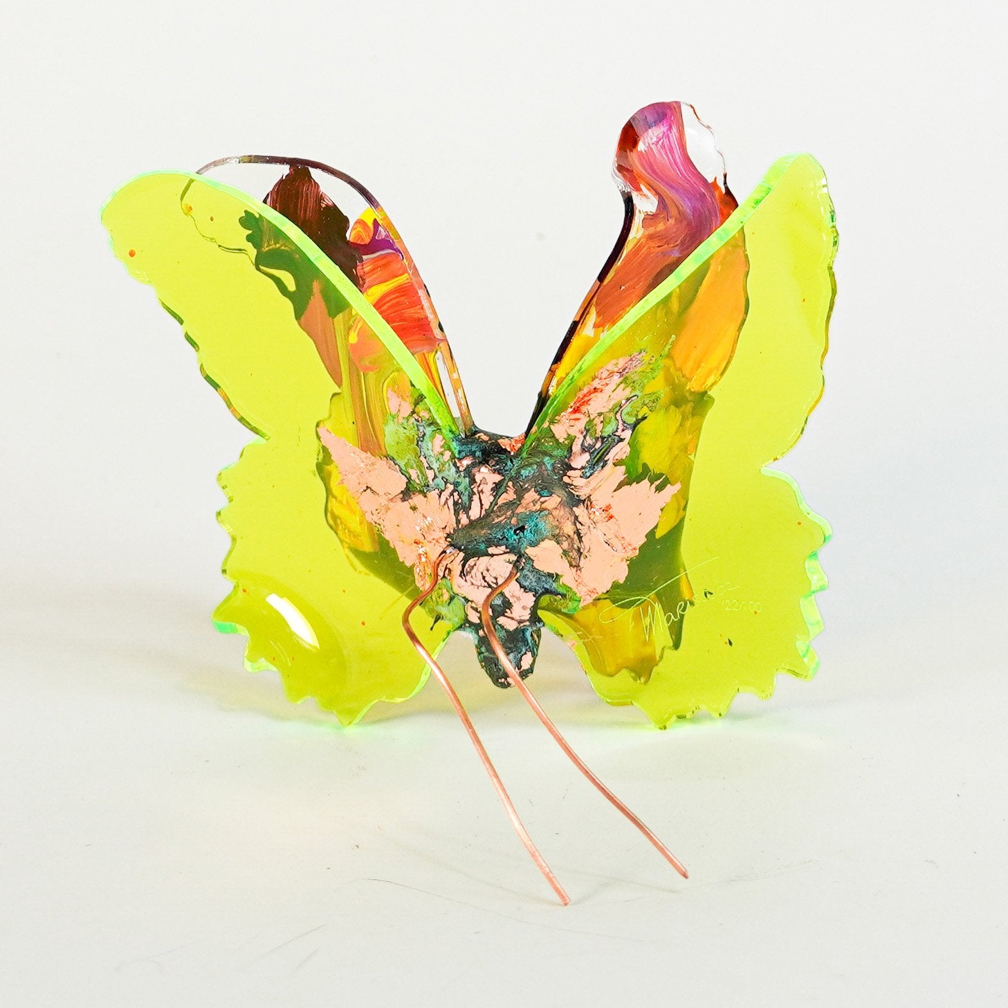 The Joy Holiday Collection - Ambar Edition is an annual series of one hundred handmade butterfly sculpture Christmas ornaments. Each piece is created from multiple layers of plexiglass, hand-painted, and bent to achieve the illusion of movement. For this limited edition, I have chosen to incorporate lime green neon-colored plexiglass and copper leaf.