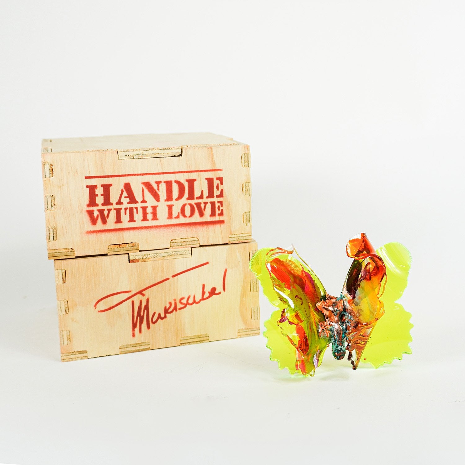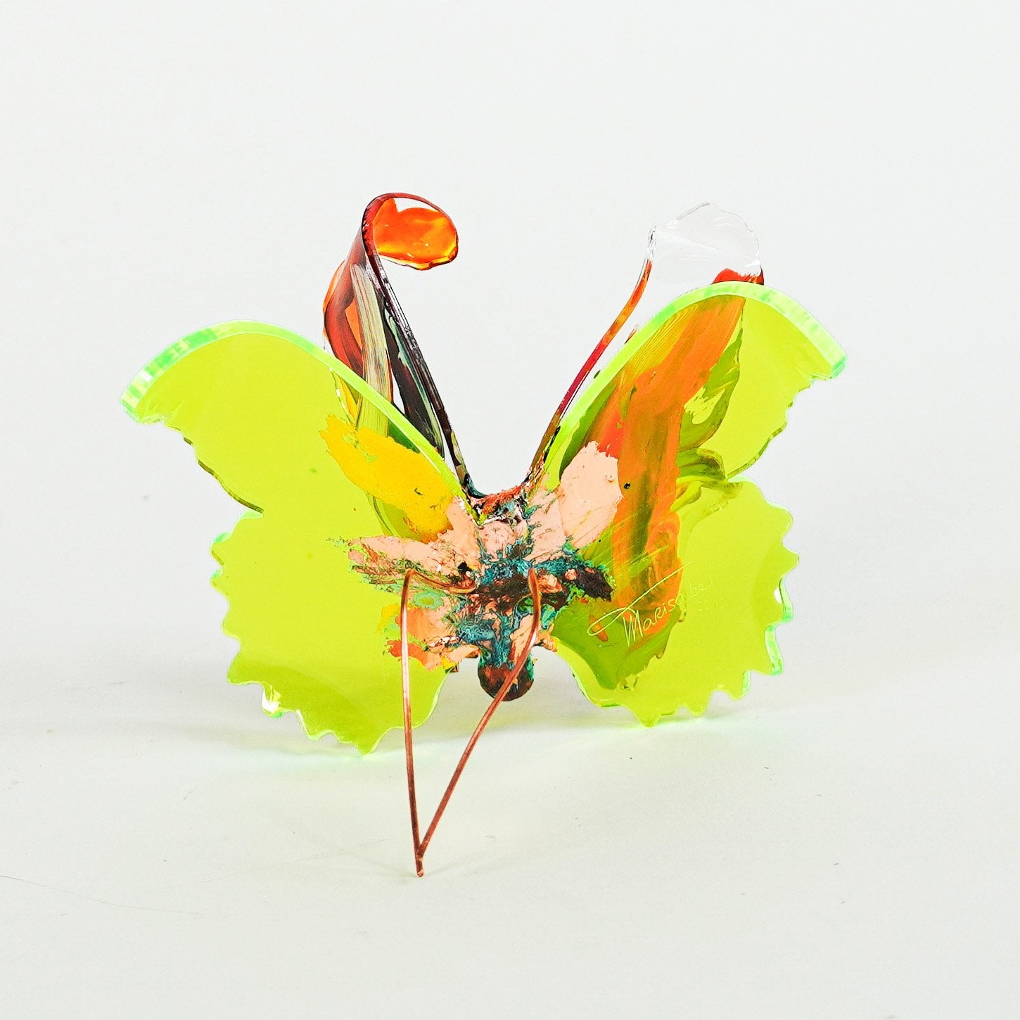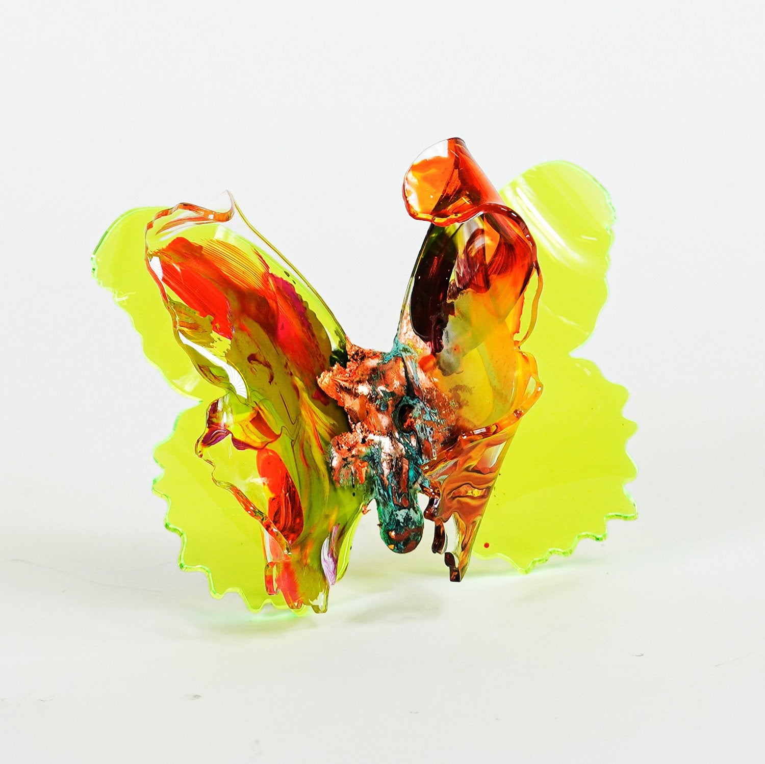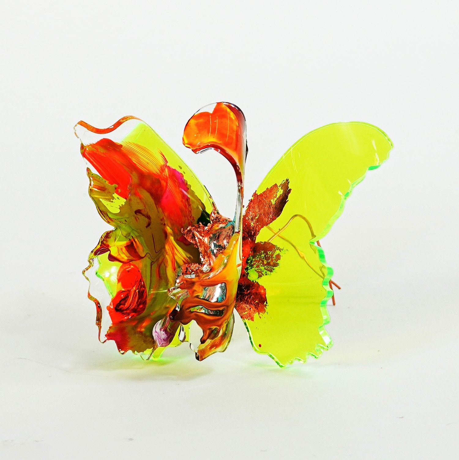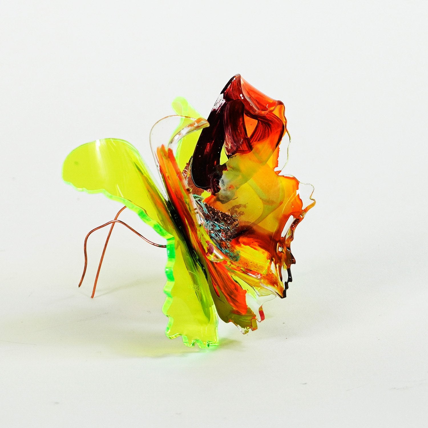 The Joy Holiday Collection - Ambar Edition is an annual series of one hundred handmade butterfly sculpture Christmas ornaments. Each piece is created from multiple layers of plexiglass, hand-painted, and bent to achieve the illusion of movement. For this limited edition, I have chosen to incorporate lime green neon-colored plexiglass and copper leaf.