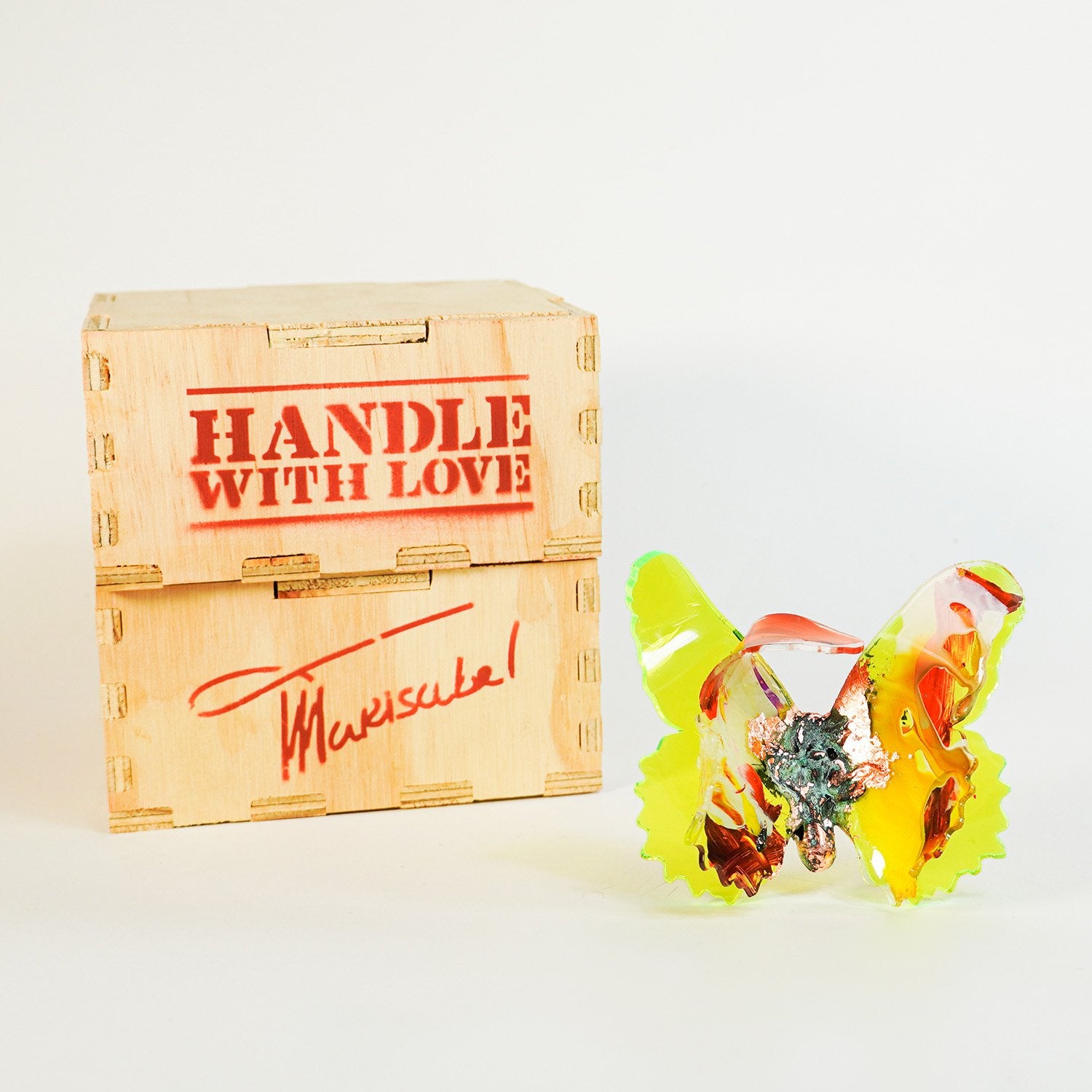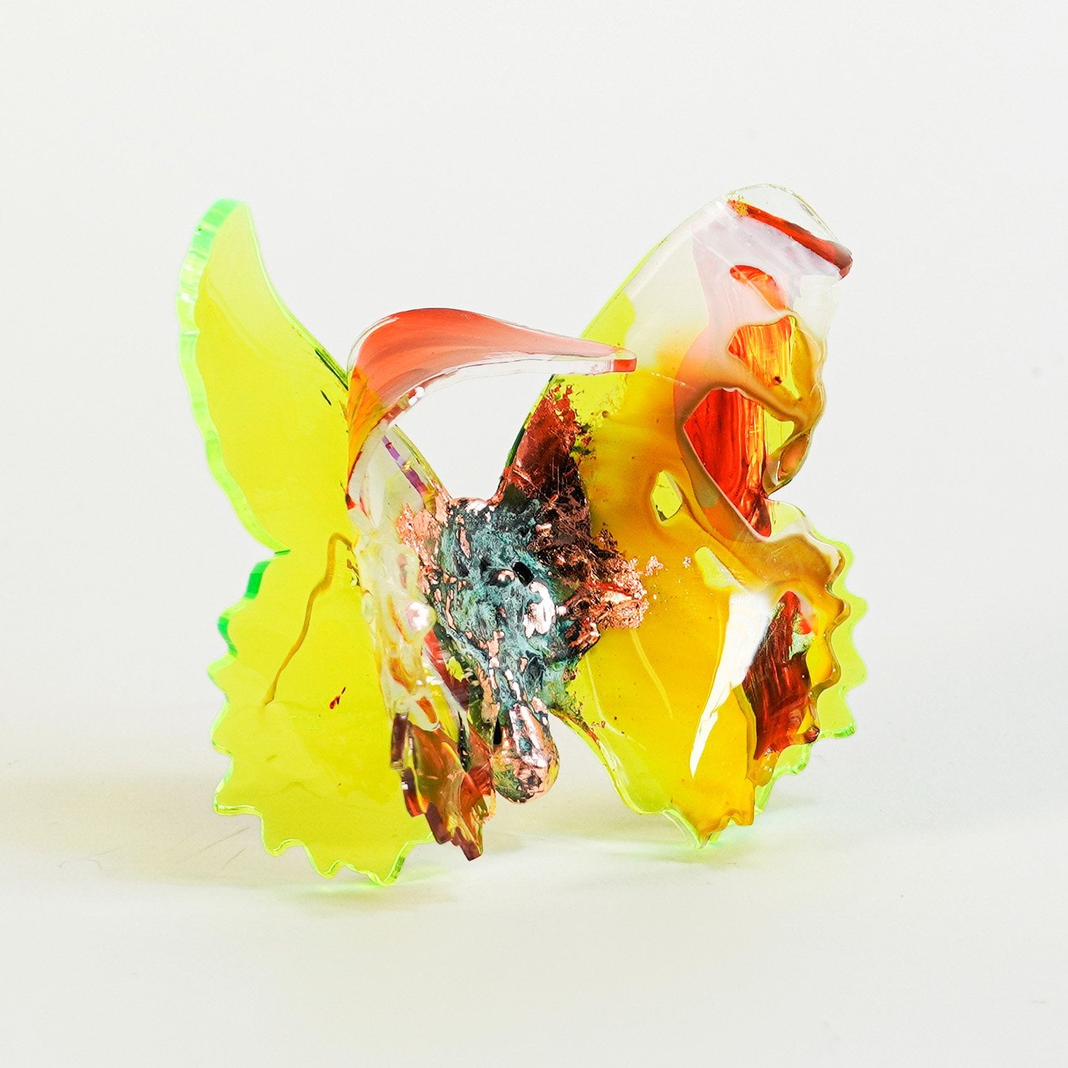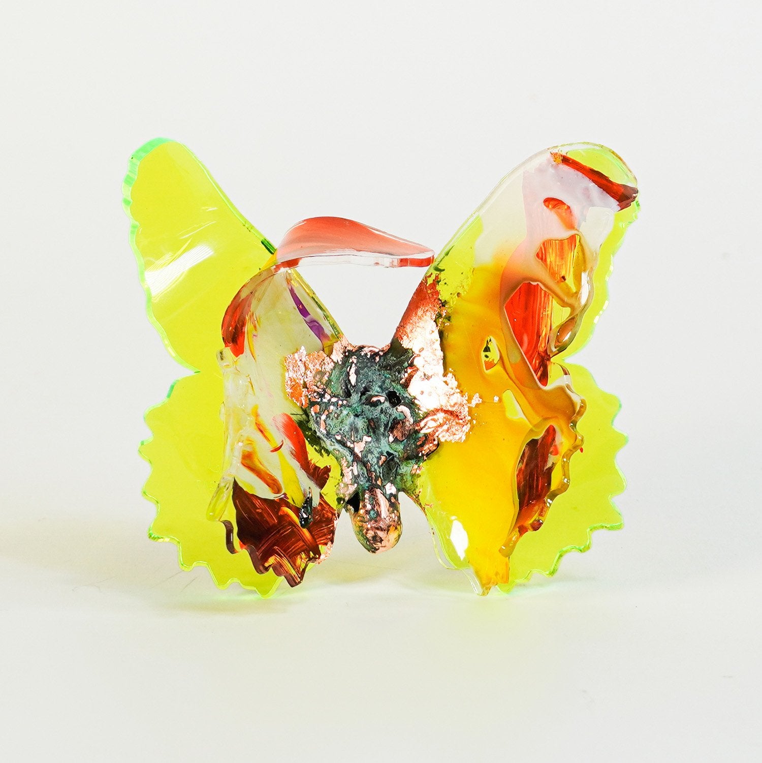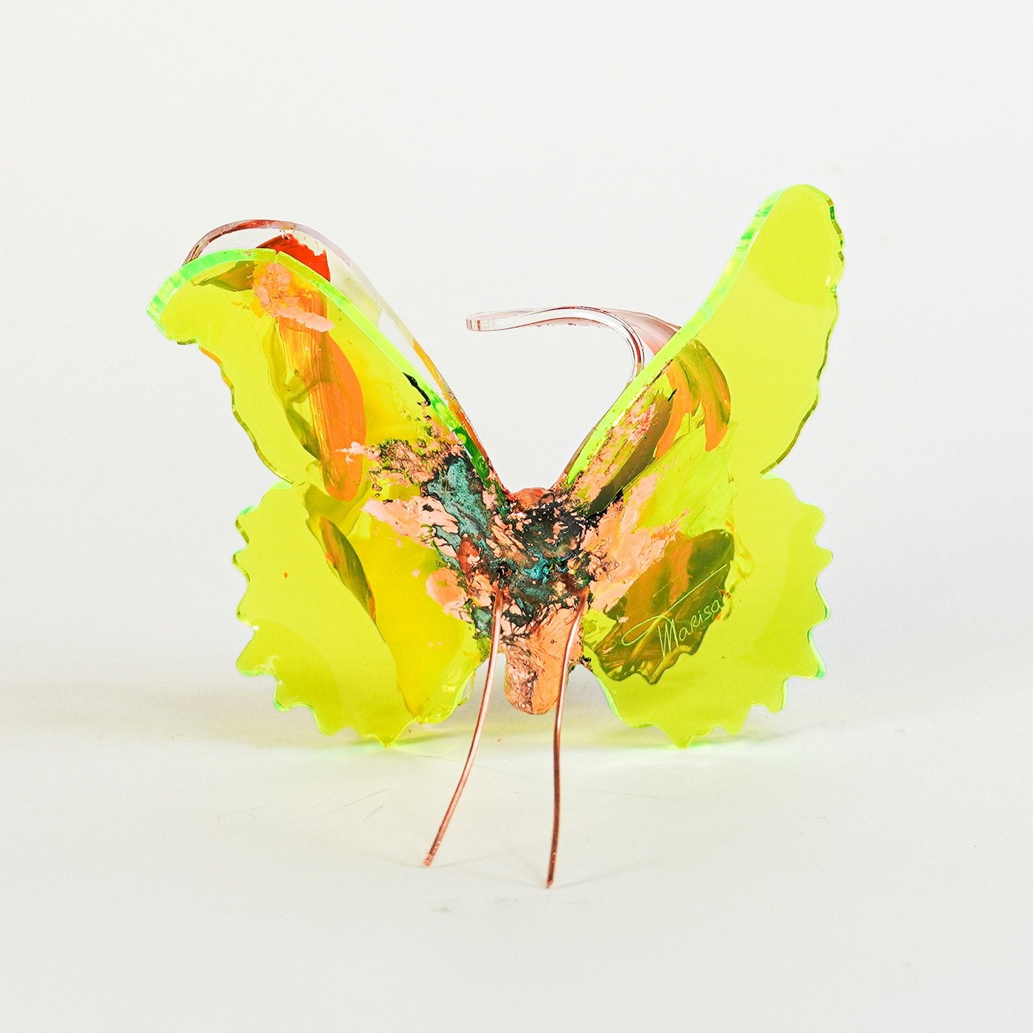 The Joy Holiday Collection - Ambar Edition is an annual series of one hundred handmade butterfly sculpture Christmas ornaments. Each piece is created from multiple layers of plexiglass, hand-painted, and bent to achieve the illusion of movement. For this limited edition, I have chosen to incorporate lime green neon-colored plexiglass and copper leaf.