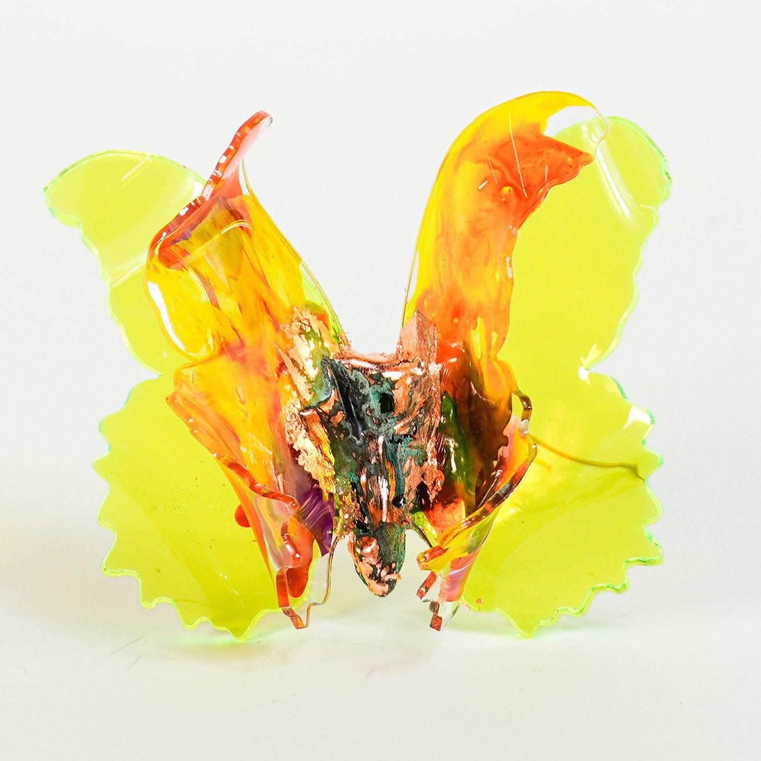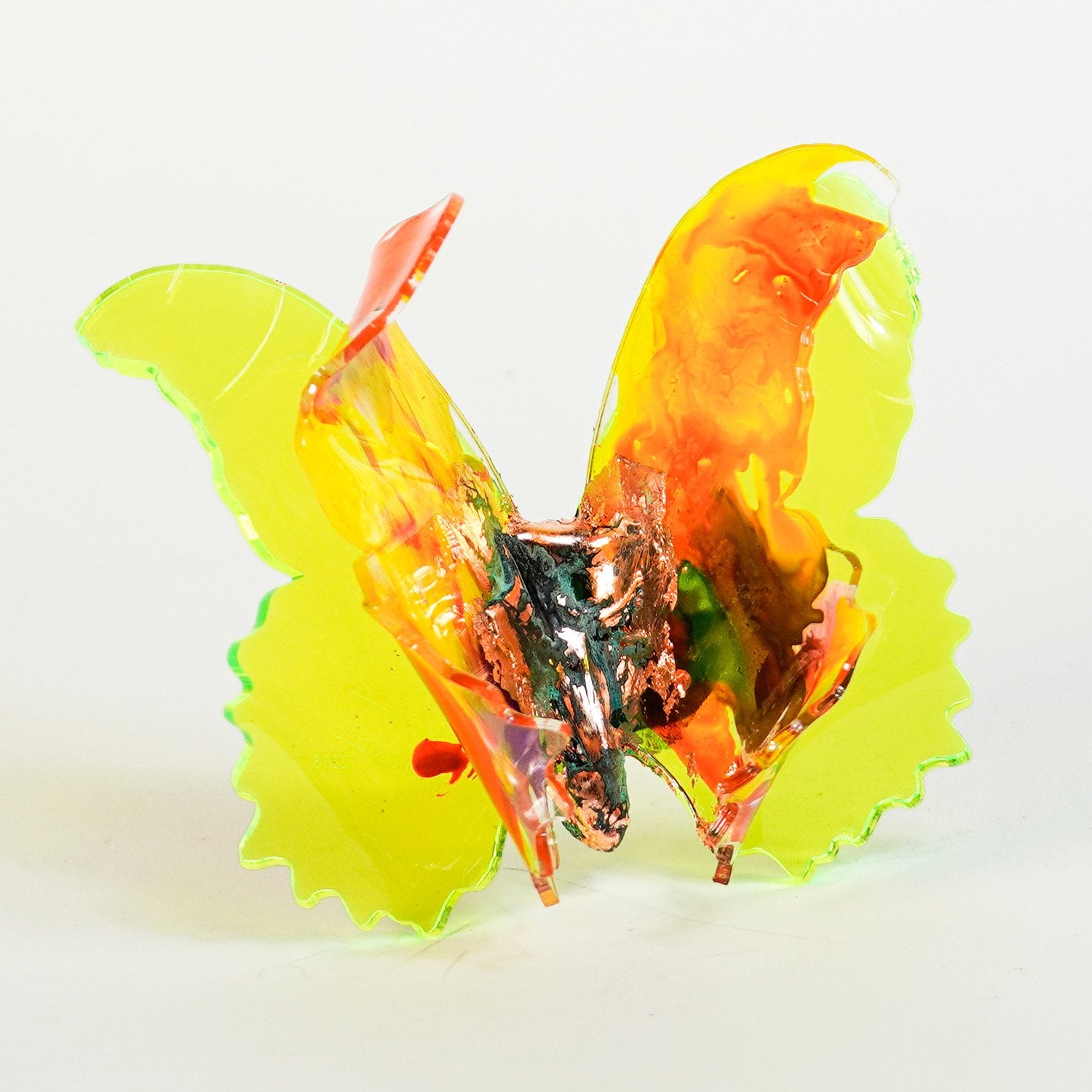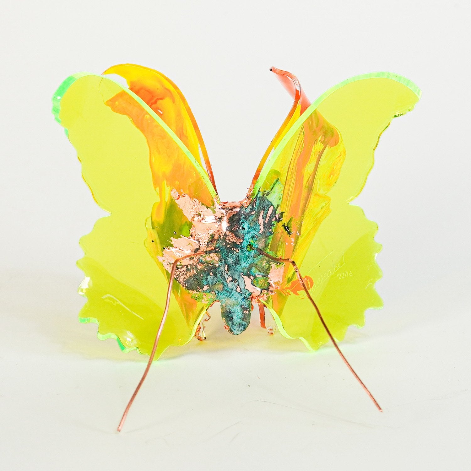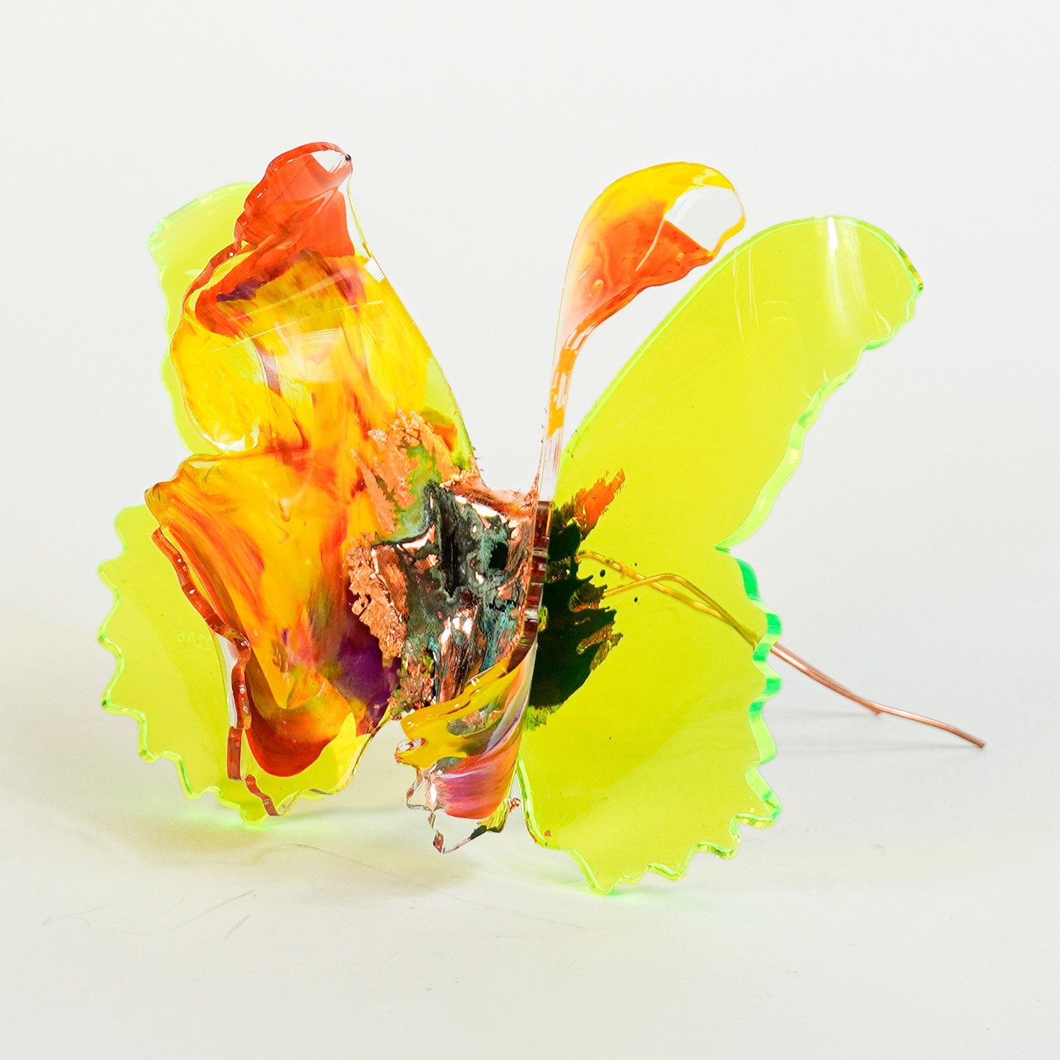 The Joy Holiday Collection - Ambar Edition is an annual series of one hundred handmade butterfly sculpture Christmas ornaments. Each piece is created from multiple layers of plexiglass, hand-painted, and bent to achieve the illusion of movement. For this limited edition, I have chosen to incorporate lime green neon-colored plexiglass and copper leaf.