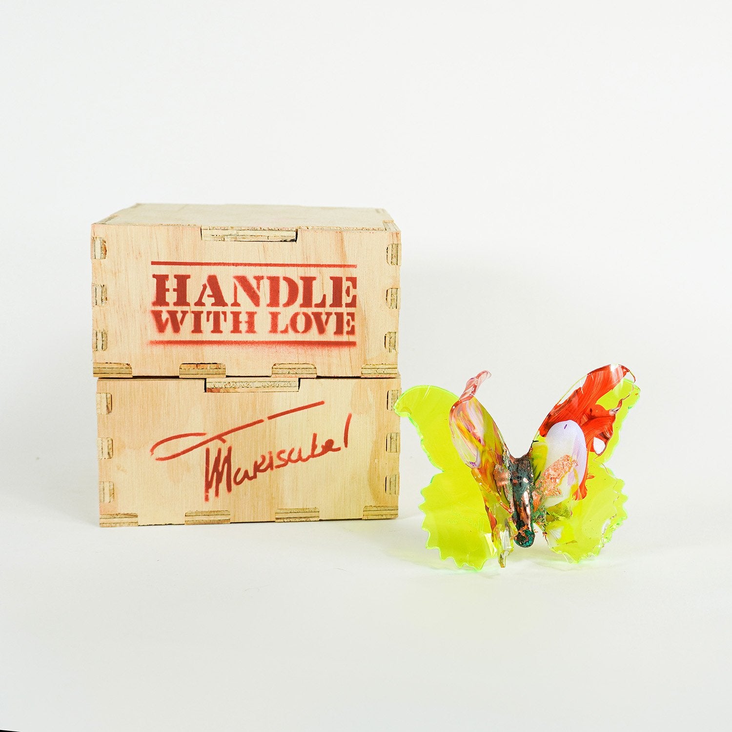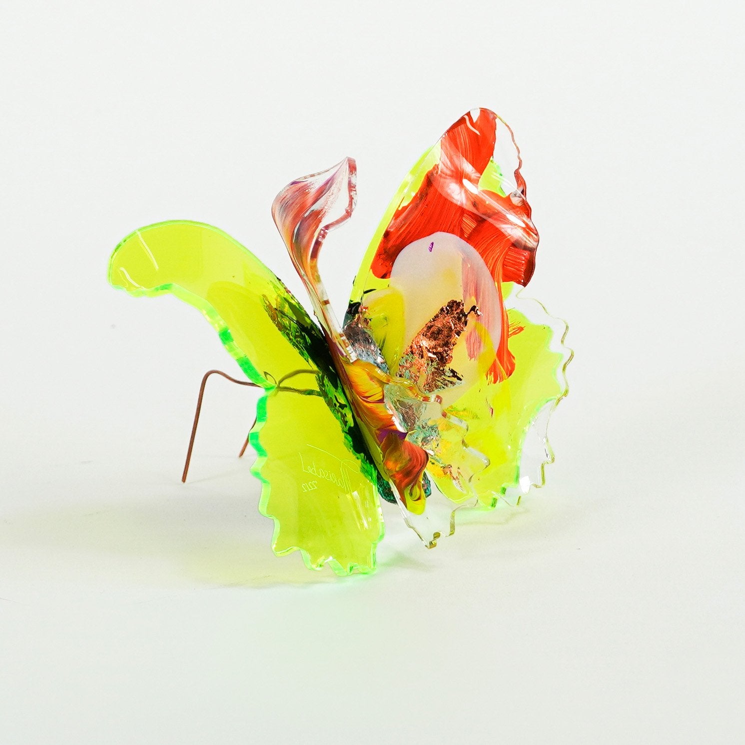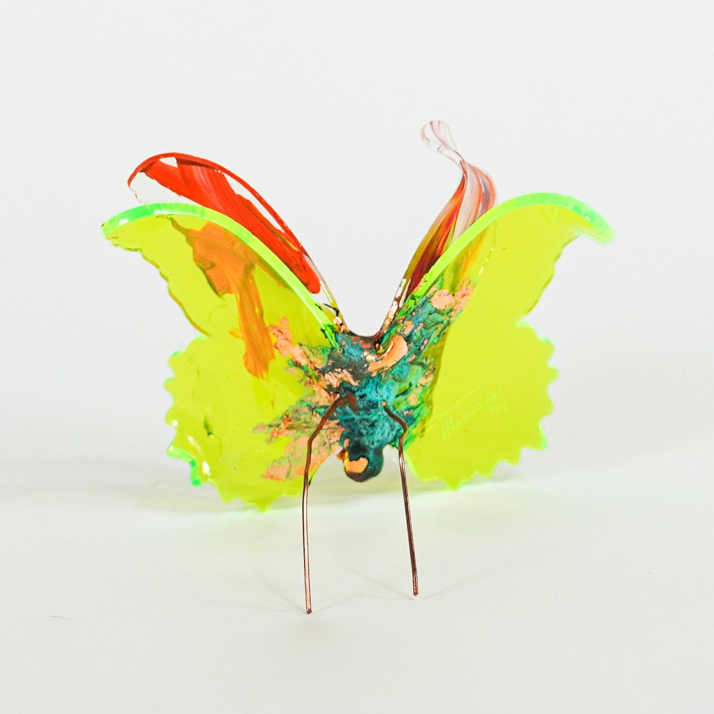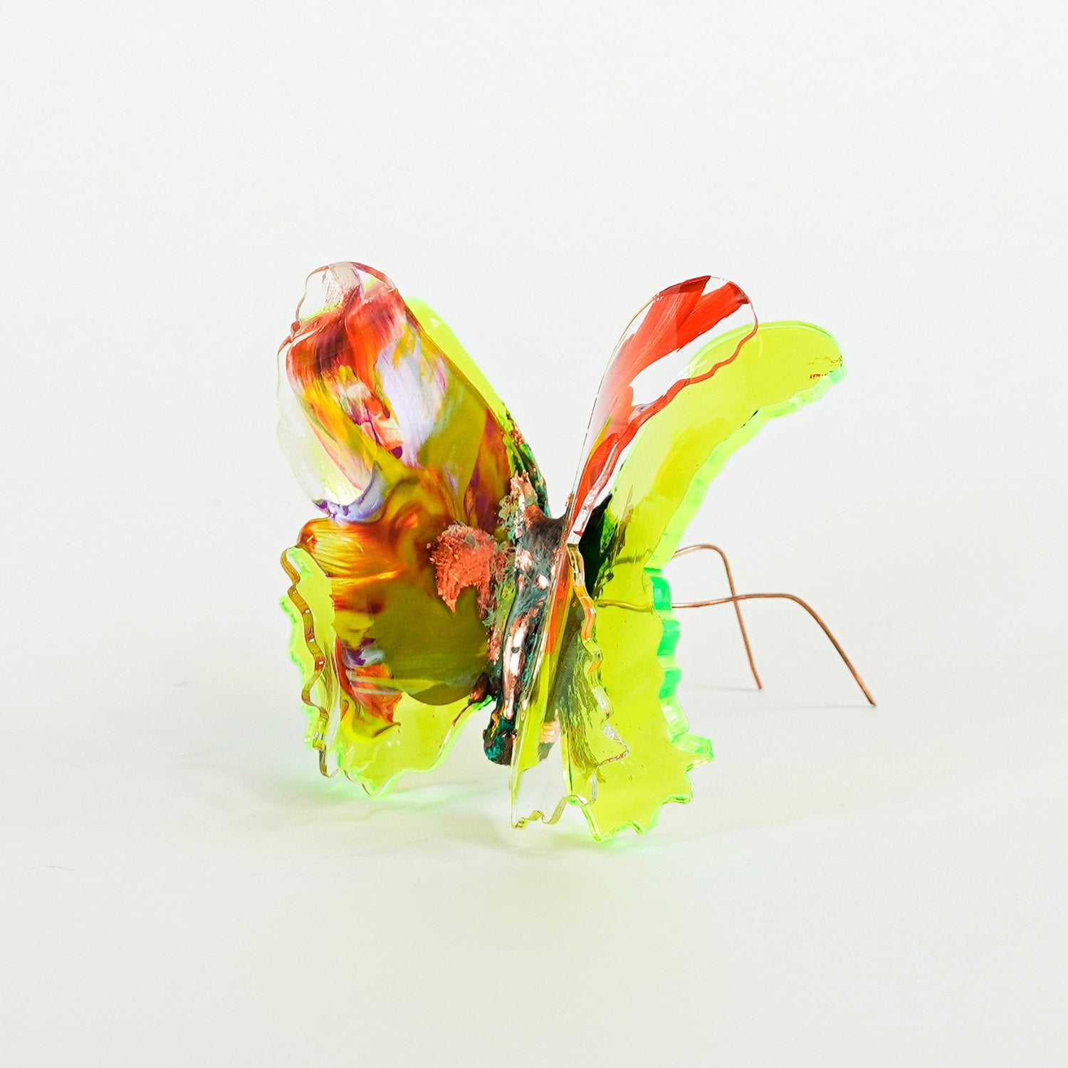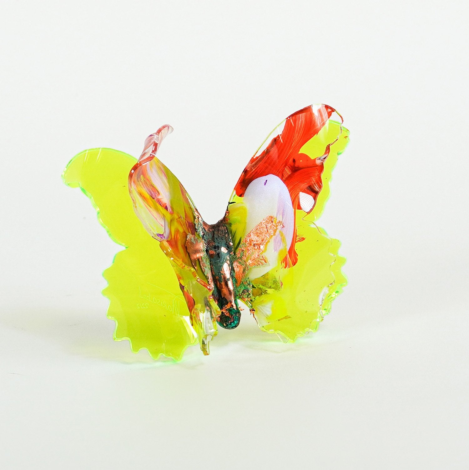 The Joy Holiday Collection - Ambar Edition is an annual series of one hundred handmade butterfly sculpture Christmas ornaments. Each piece is created from multiple layers of plexiglass, hand-painted, and bent to achieve the illusion of movement. For this limited edition, I have chosen to incorporate lime green neon-colored plexiglass and copper leaf.
