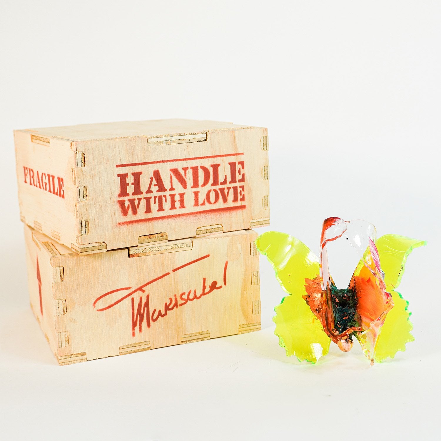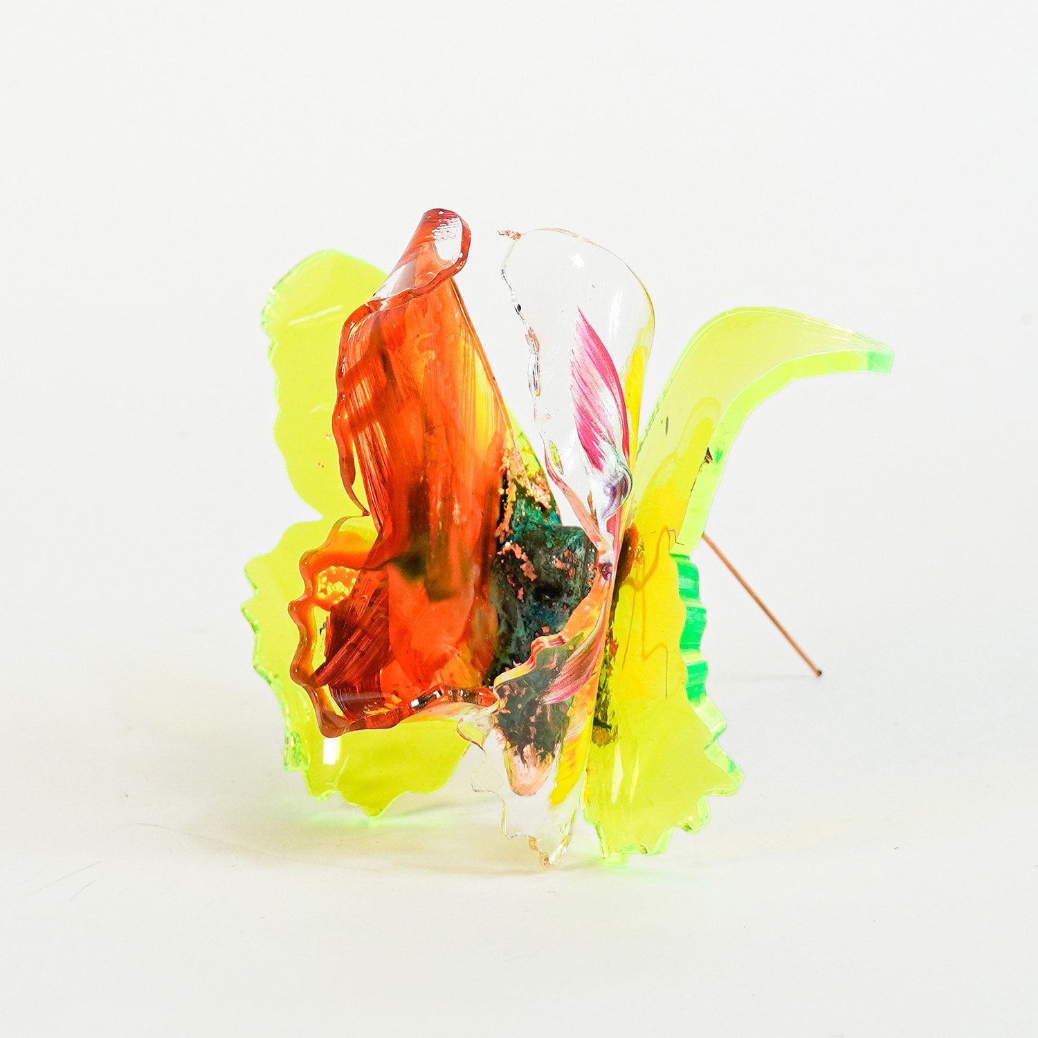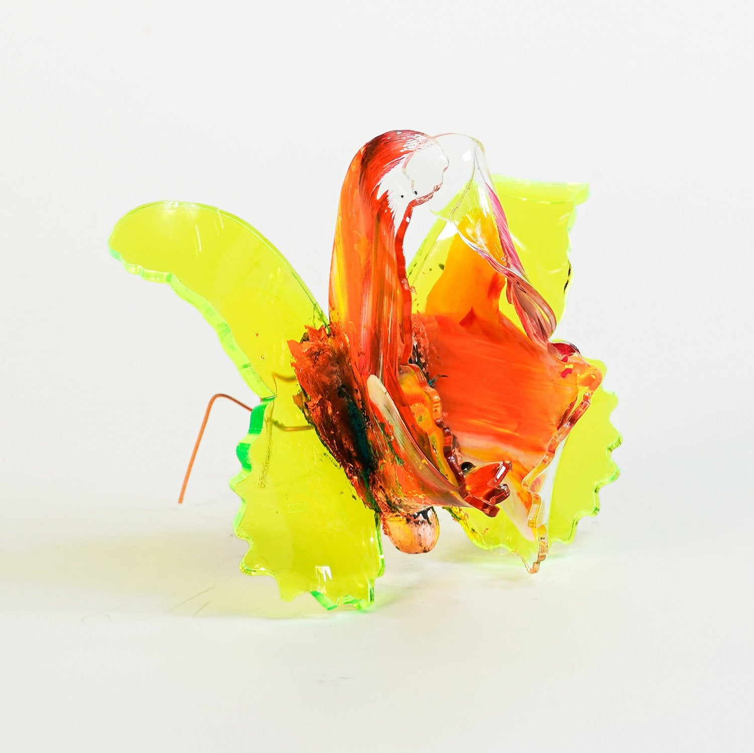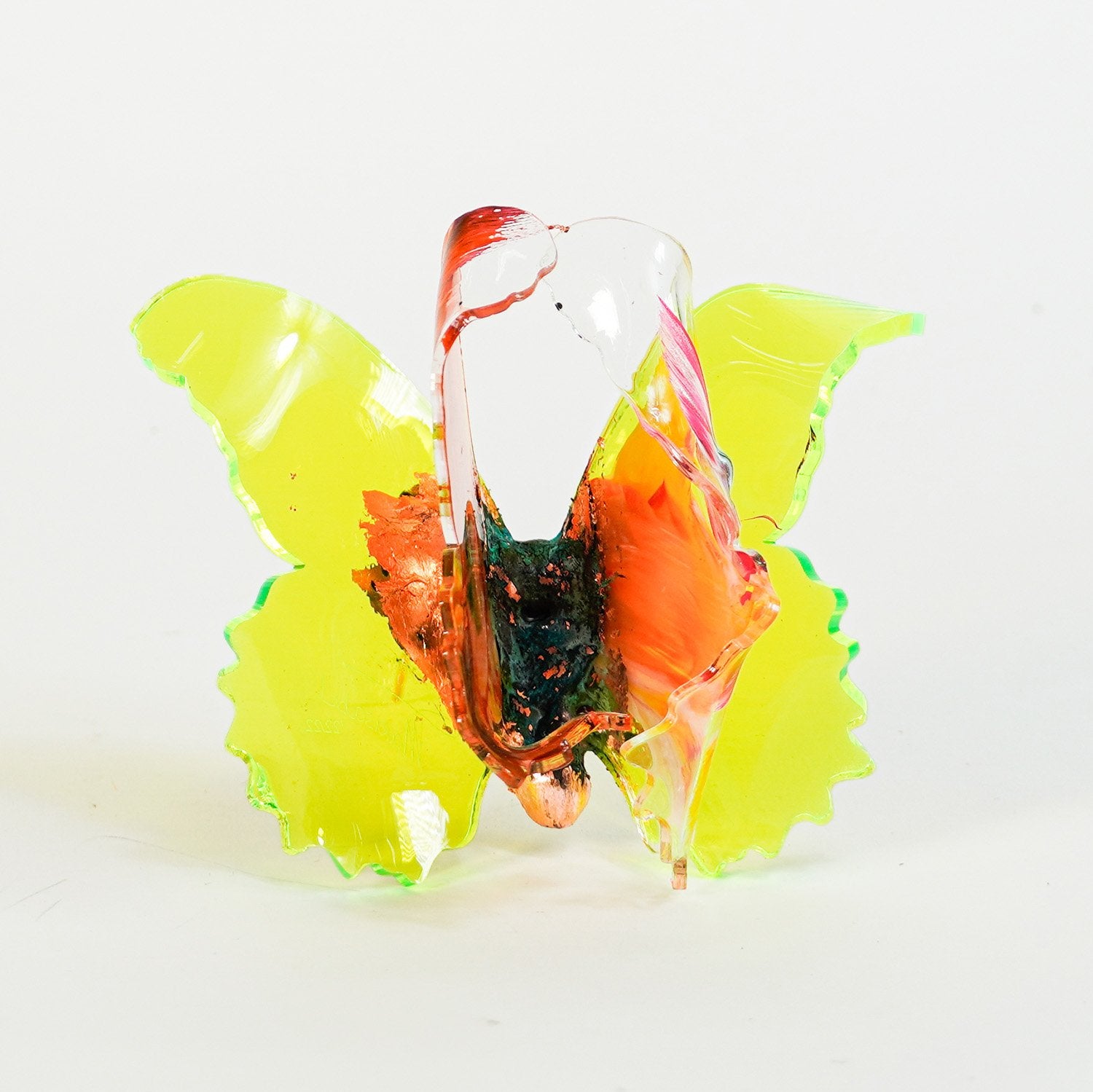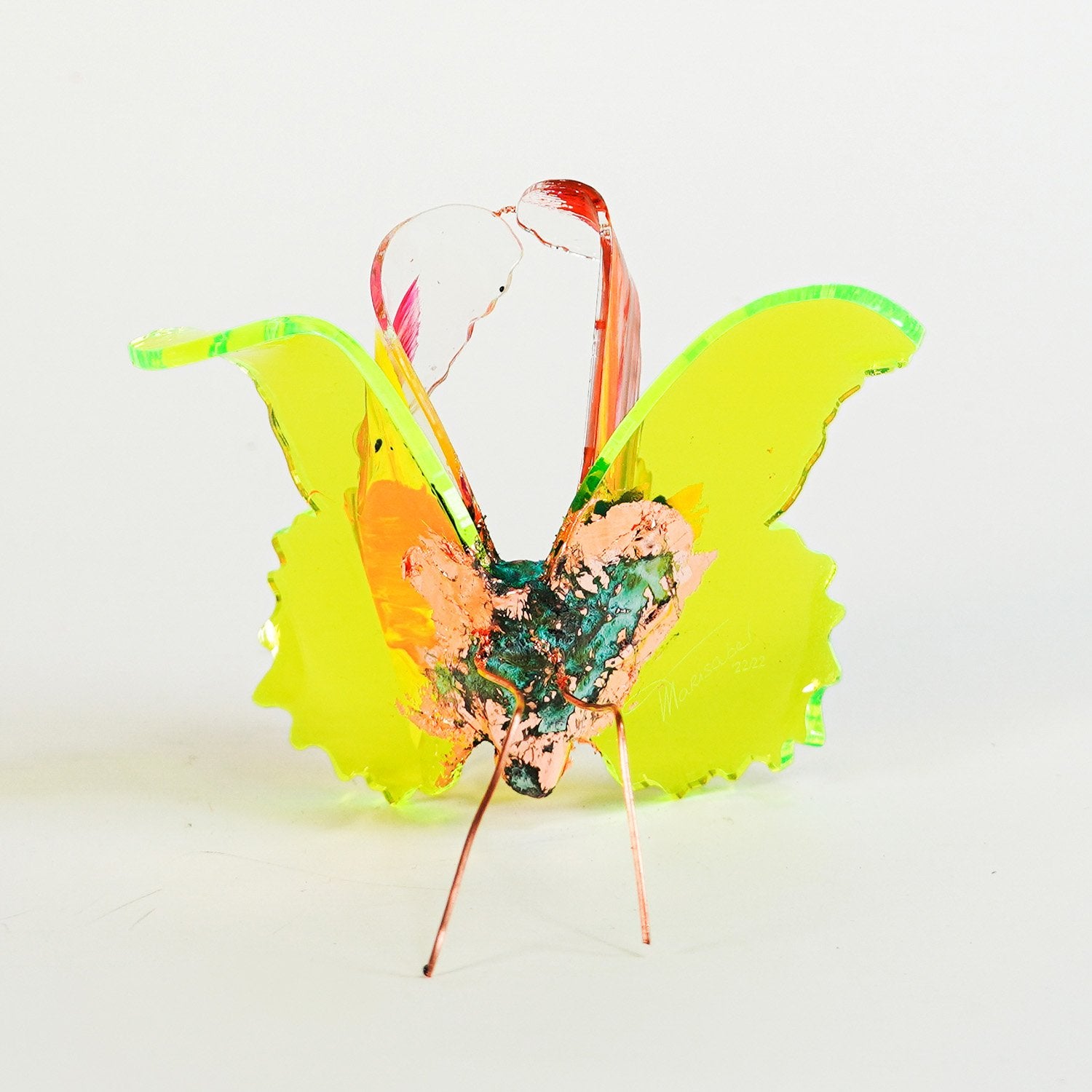 The Joy Holiday Collection - Ambar Edition is an annual series of one hundred handmade butterfly sculpture Christmas ornaments. Each piece is created from multiple layers of plexiglass, hand-painted, and bent to achieve the illusion of movement. For this limited edition, I have chosen to incorporate lime green neon-colored plexiglass and copper leaf.