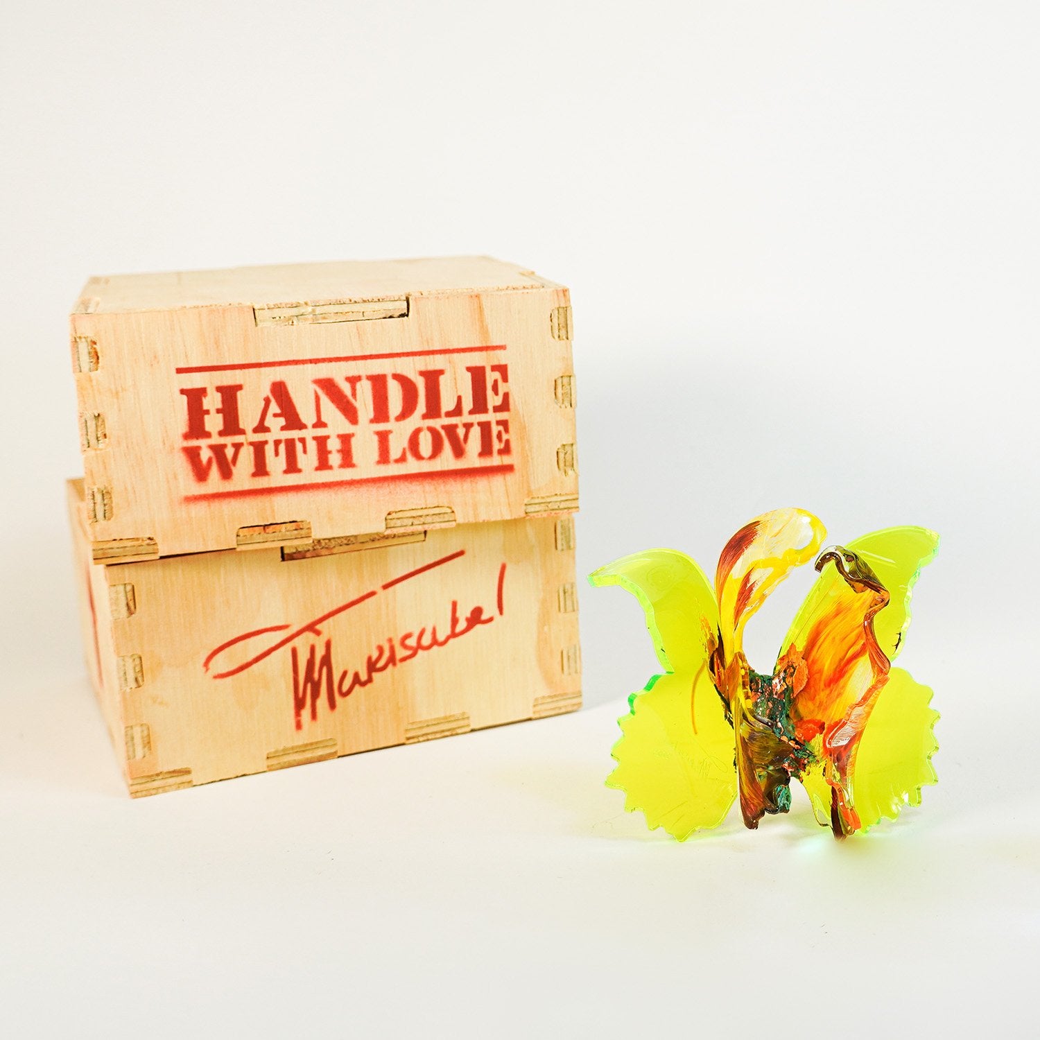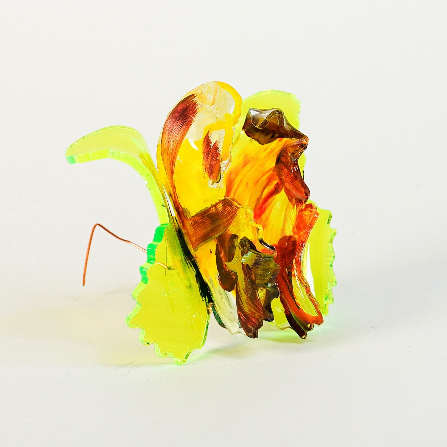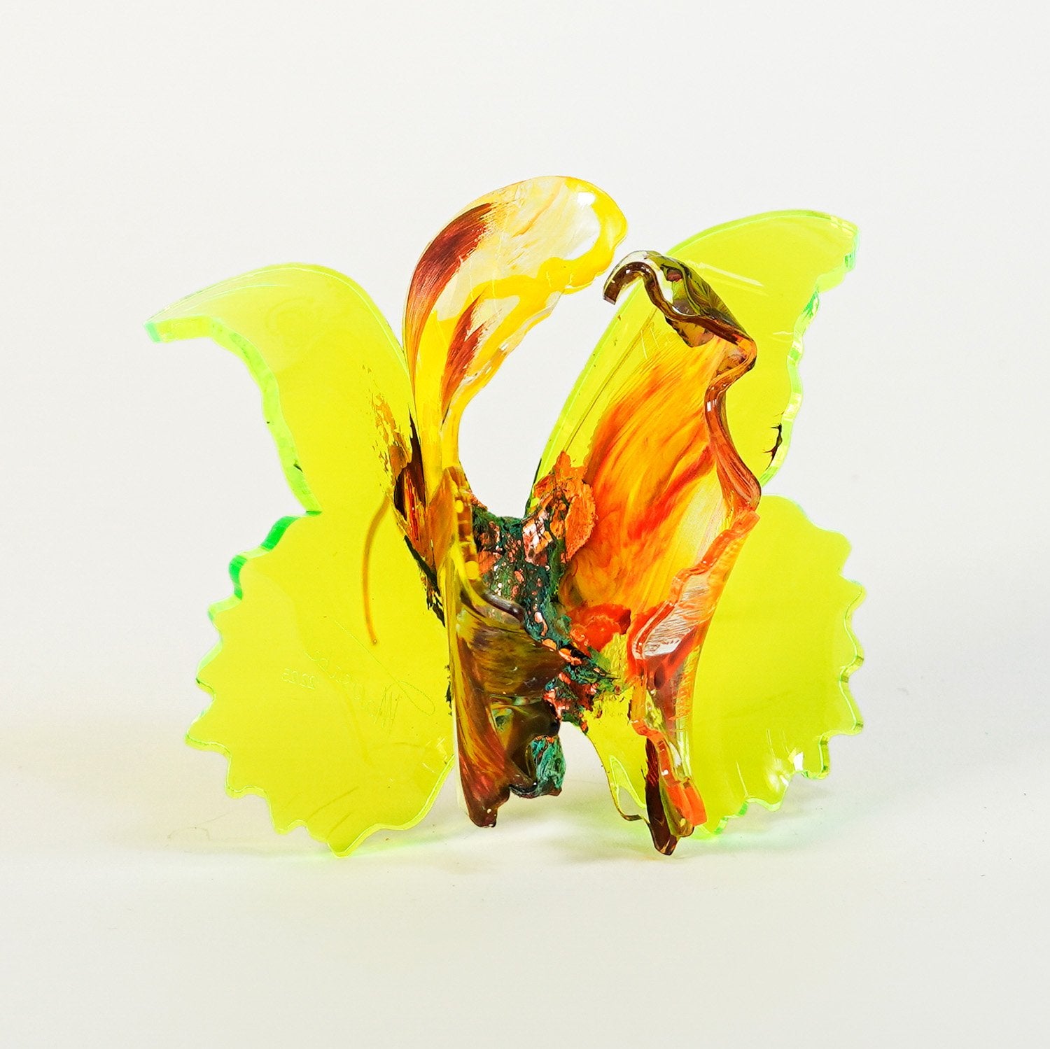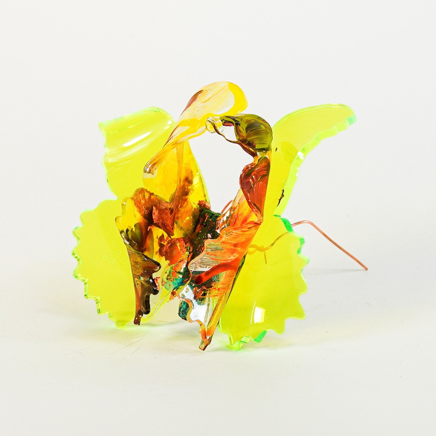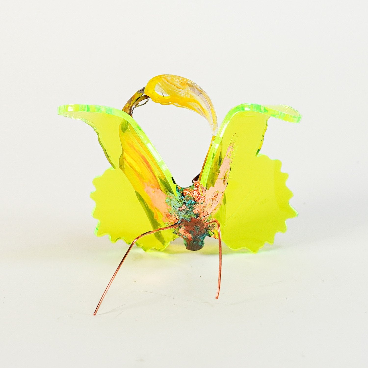 The Joy Holiday Collection - Ambar Edition is an annual series of one hundred handmade butterfly sculpture Christmas ornaments. Each piece is created from multiple layers of plexiglass, hand-painted, and bent to achieve the illusion of movement. For this limited edition, I have chosen to incorporate lime green neon-colored plexiglass and copper leaf.
