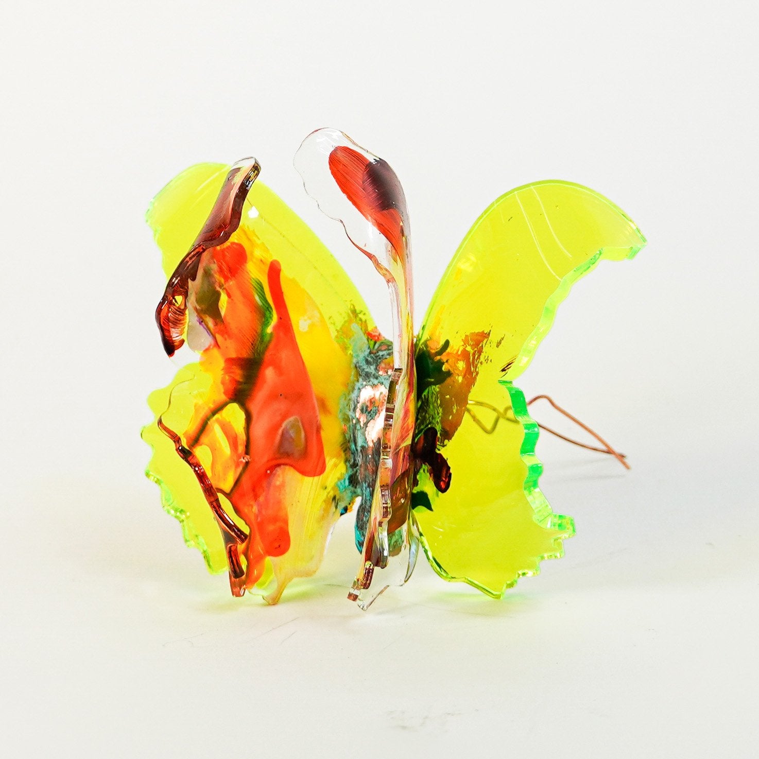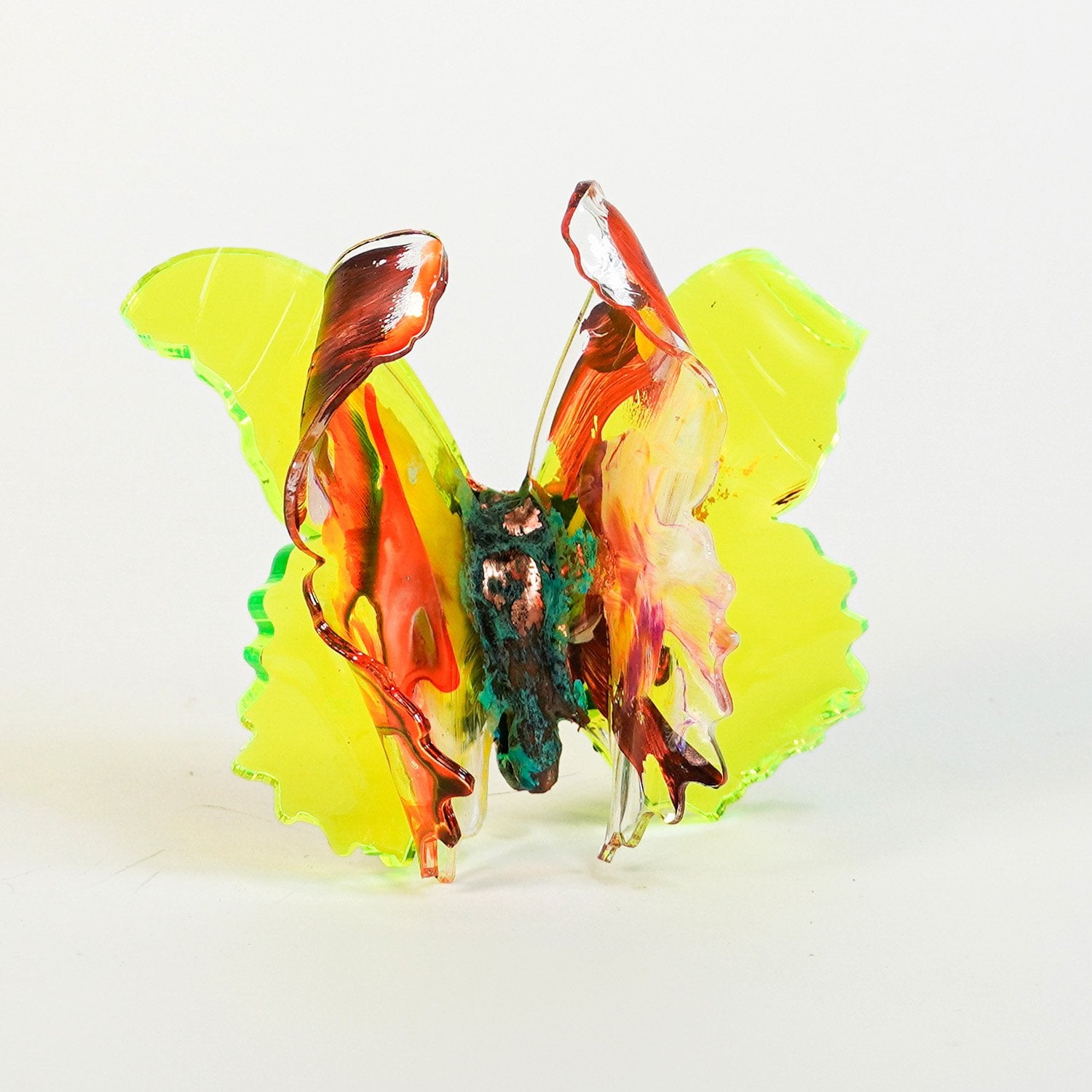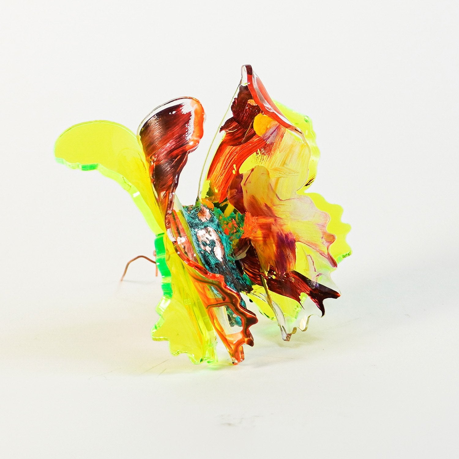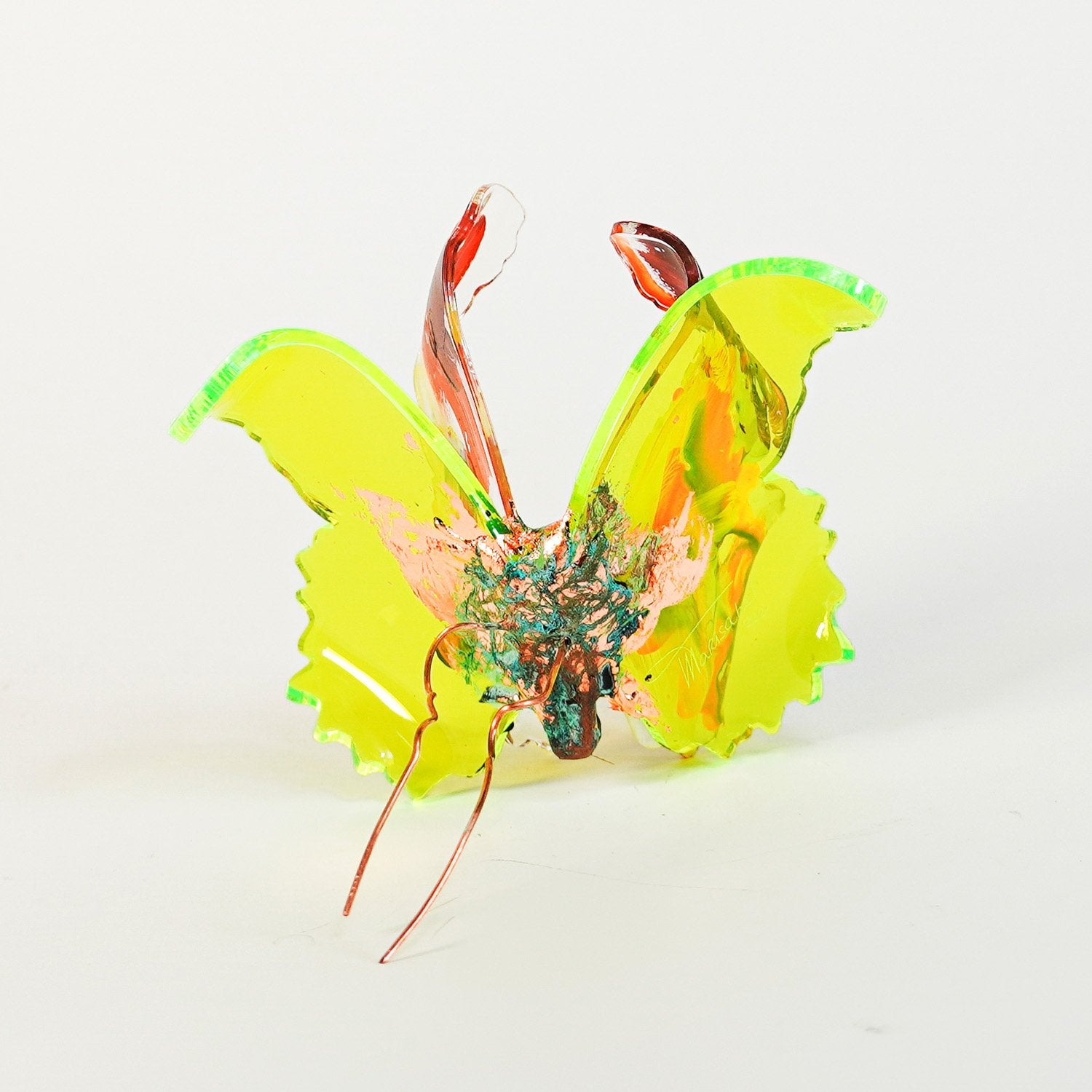 The Joy Holiday Collection - Ambar Edition is an annual series of one hundred handmade butterfly sculpture Christmas ornaments. Each piece is created from multiple layers of plexiglass, hand-painted, and bent to achieve the illusion of movement. For this limited edition, I have chosen to incorporate lime green neon-colored plexiglass and copper leaf.