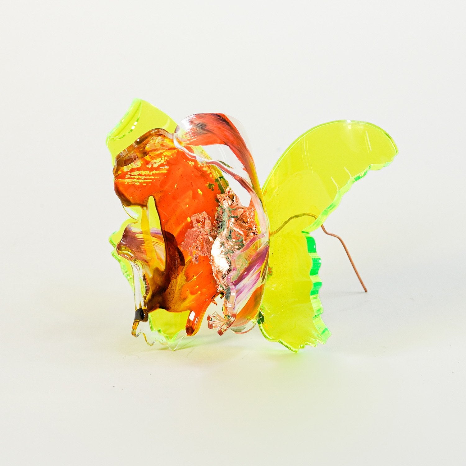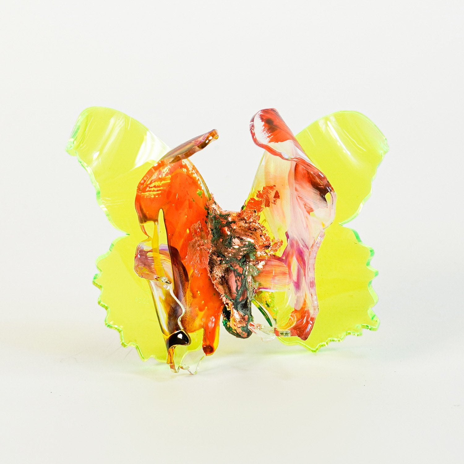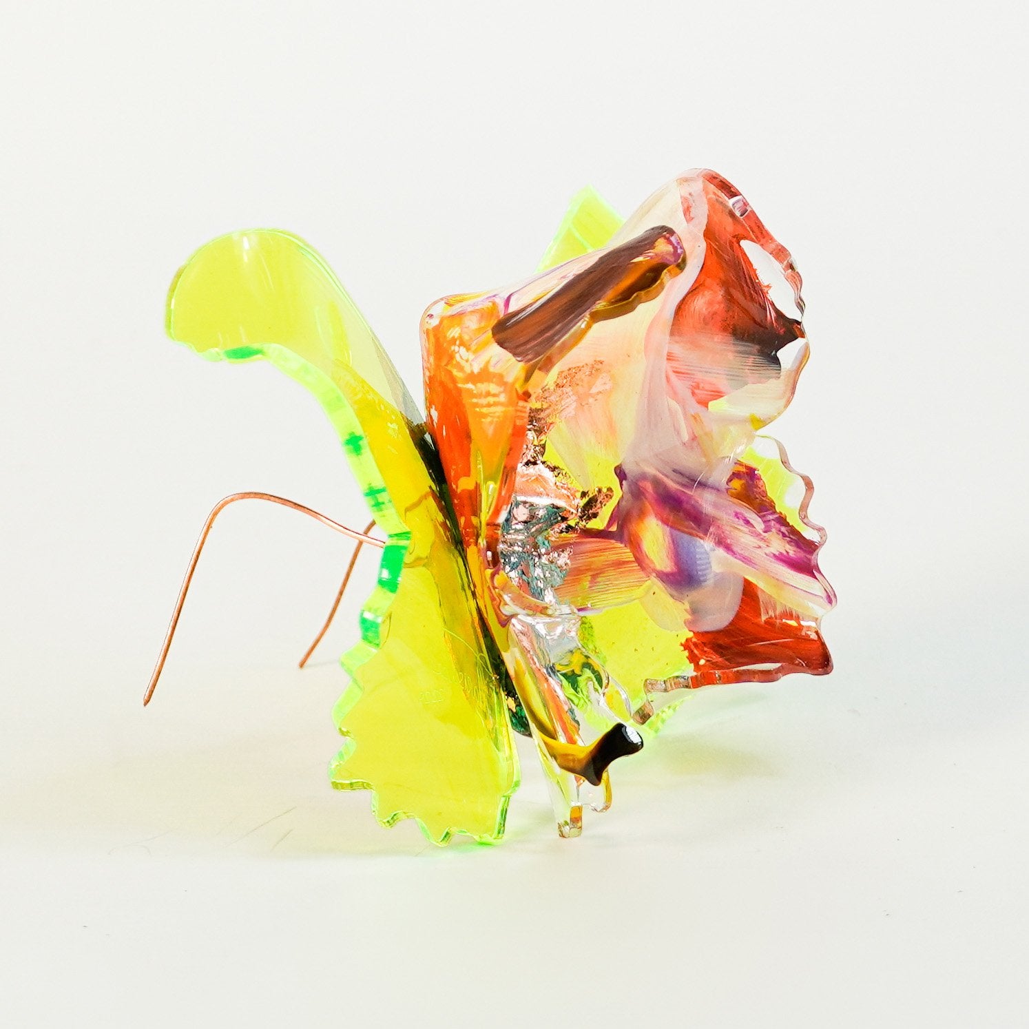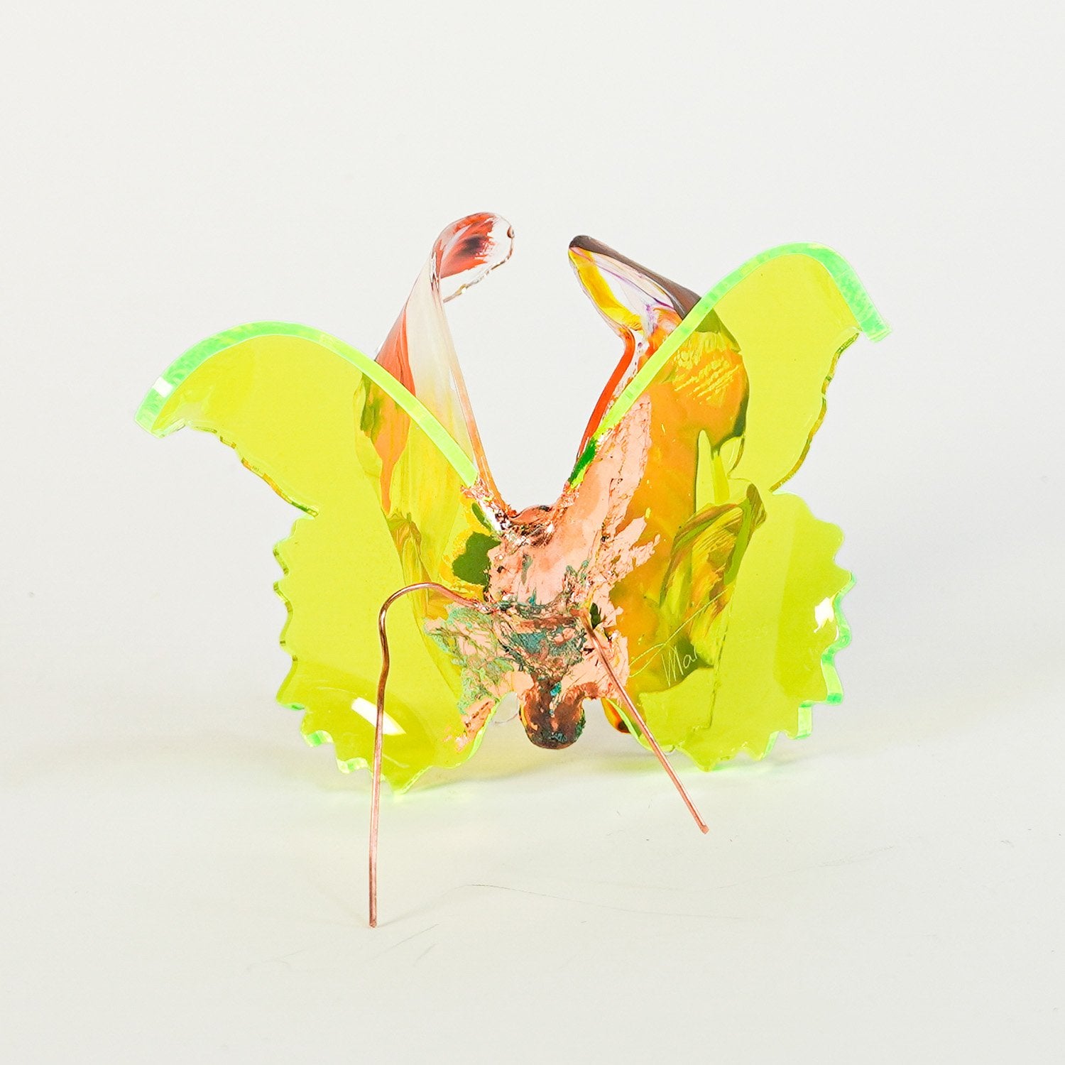 The Joy Holiday Collection - Ambar Edition is an annual series of one hundred handmade butterfly sculpture Christmas ornaments. Each piece is created from multiple layers of plexiglass, hand-painted, and bent to achieve the illusion of movement. For this limited edition, I have chosen to incorporate lime green neon-colored plexiglass and copper leaf.