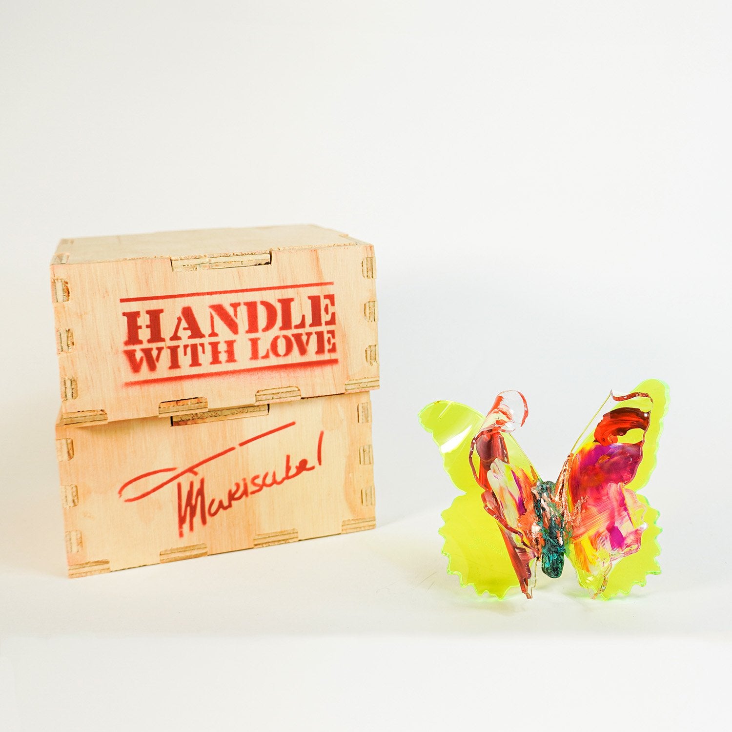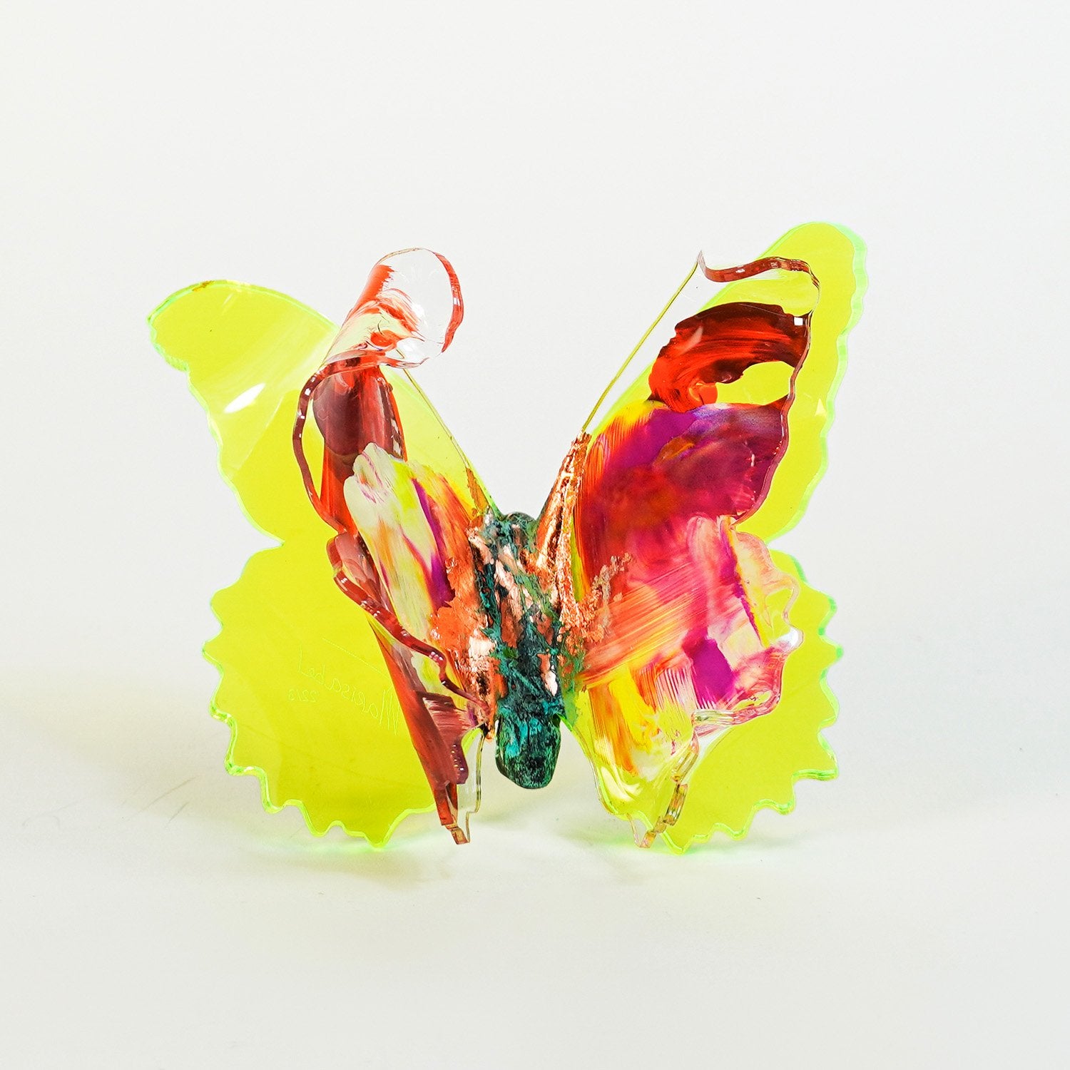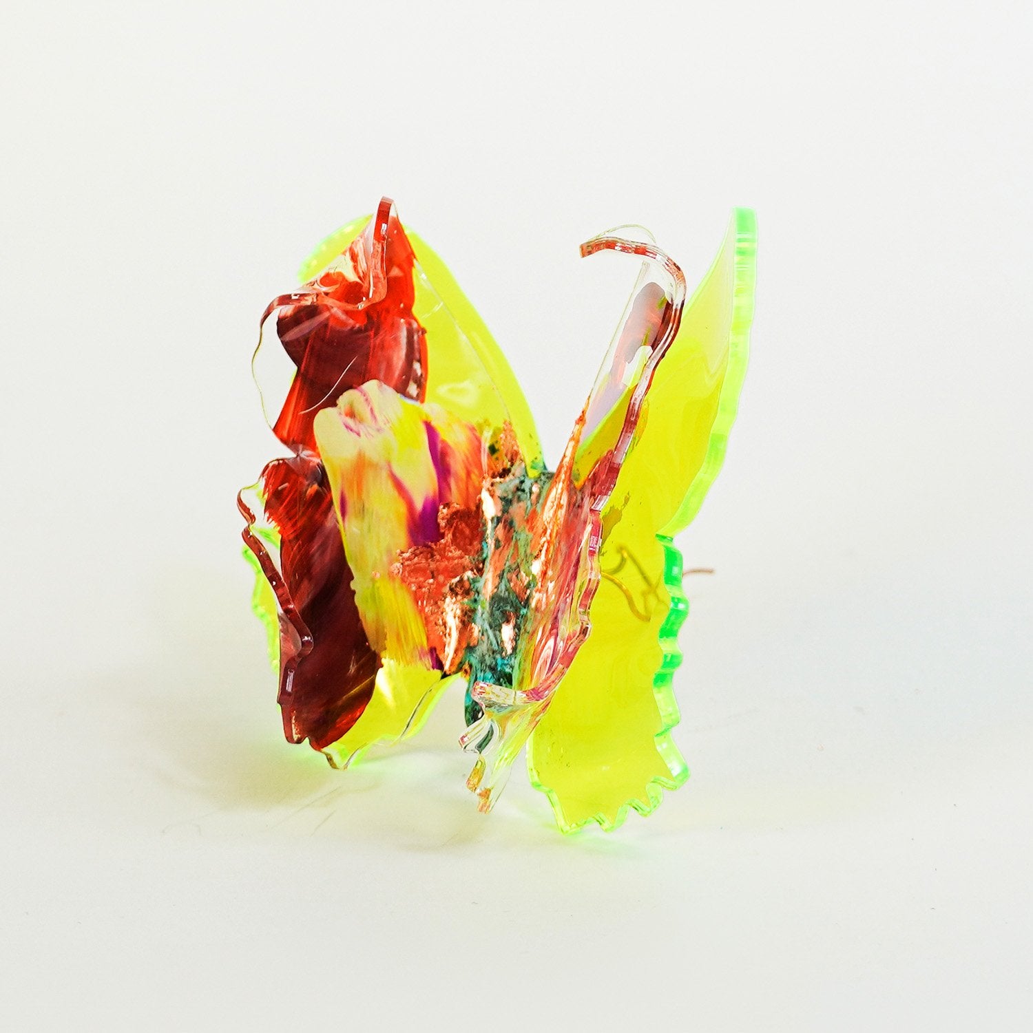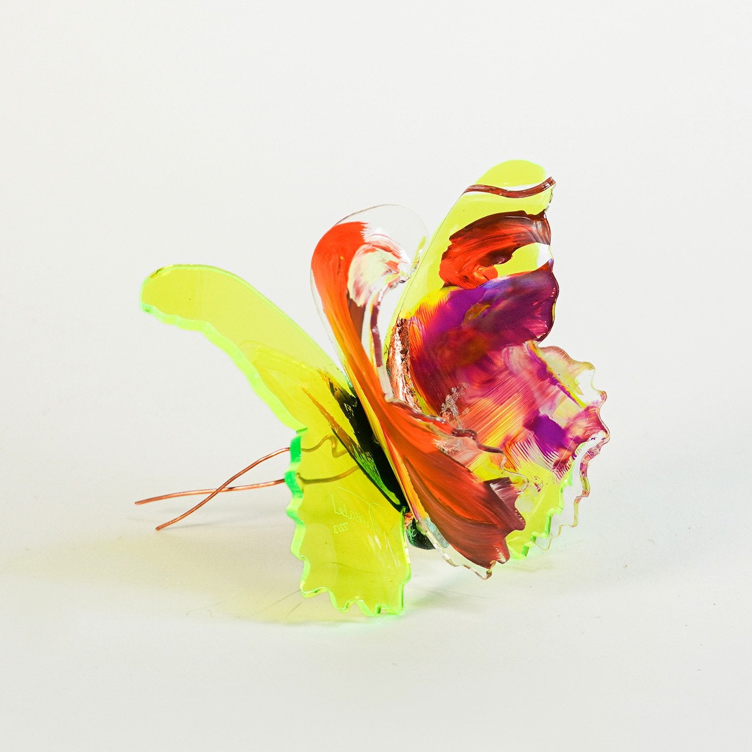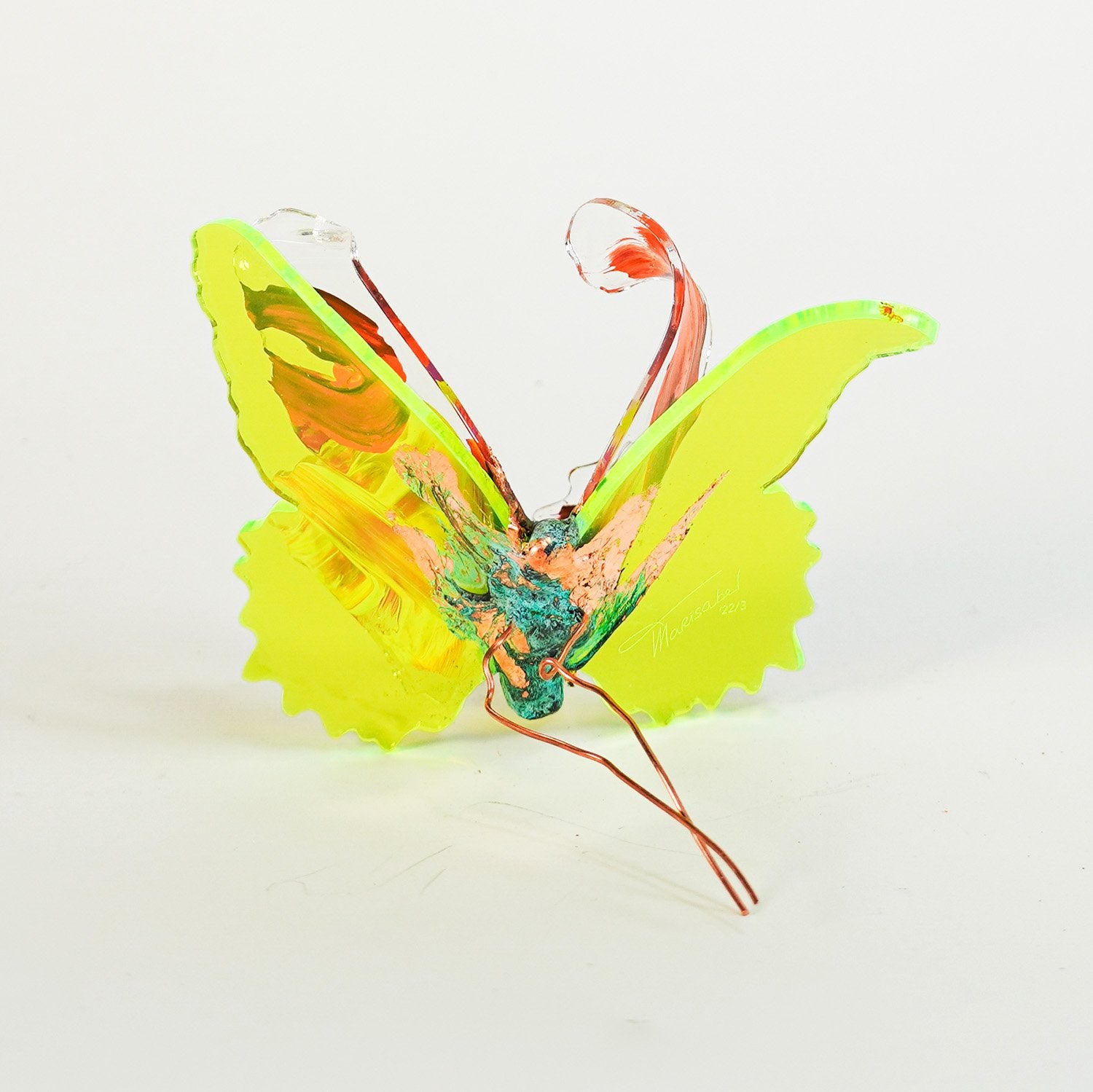 The Joy Holiday Collection - Ambar Edition is an annual series of one hundred handmade butterfly sculpture Christmas ornaments. Each piece is created from multiple layers of plexiglass, hand-painted, and bent to achieve the illusion of movement. For this limited edition, I have chosen to incorporate lime green neon-colored plexiglass and copper leaf.