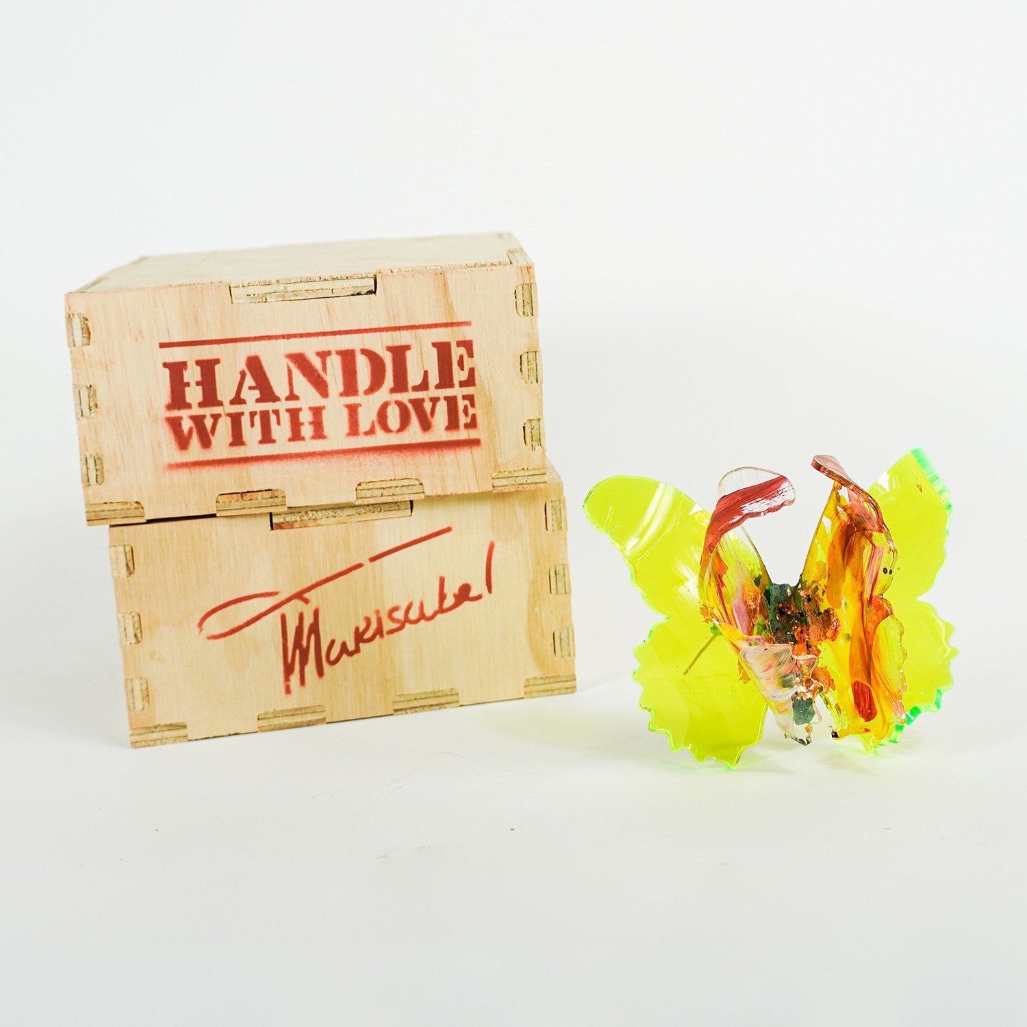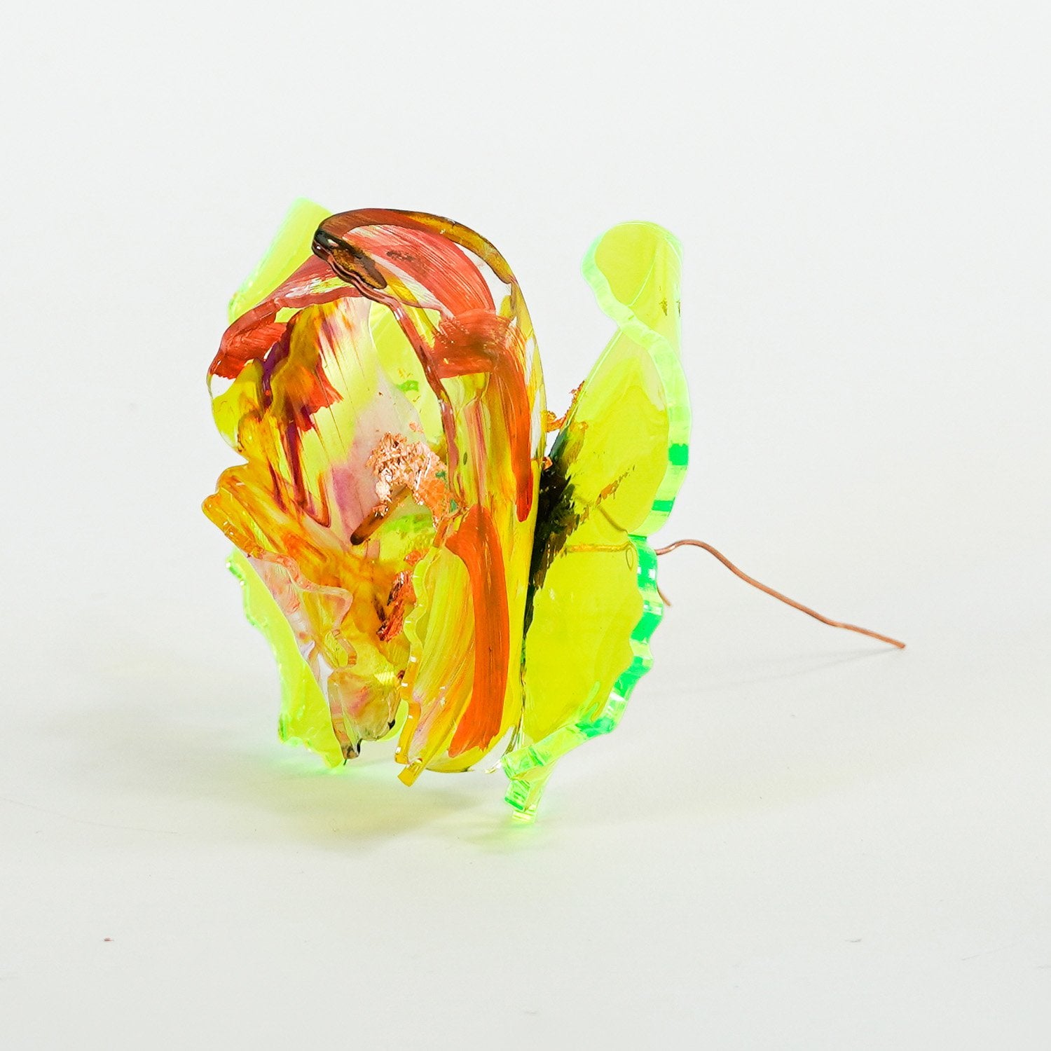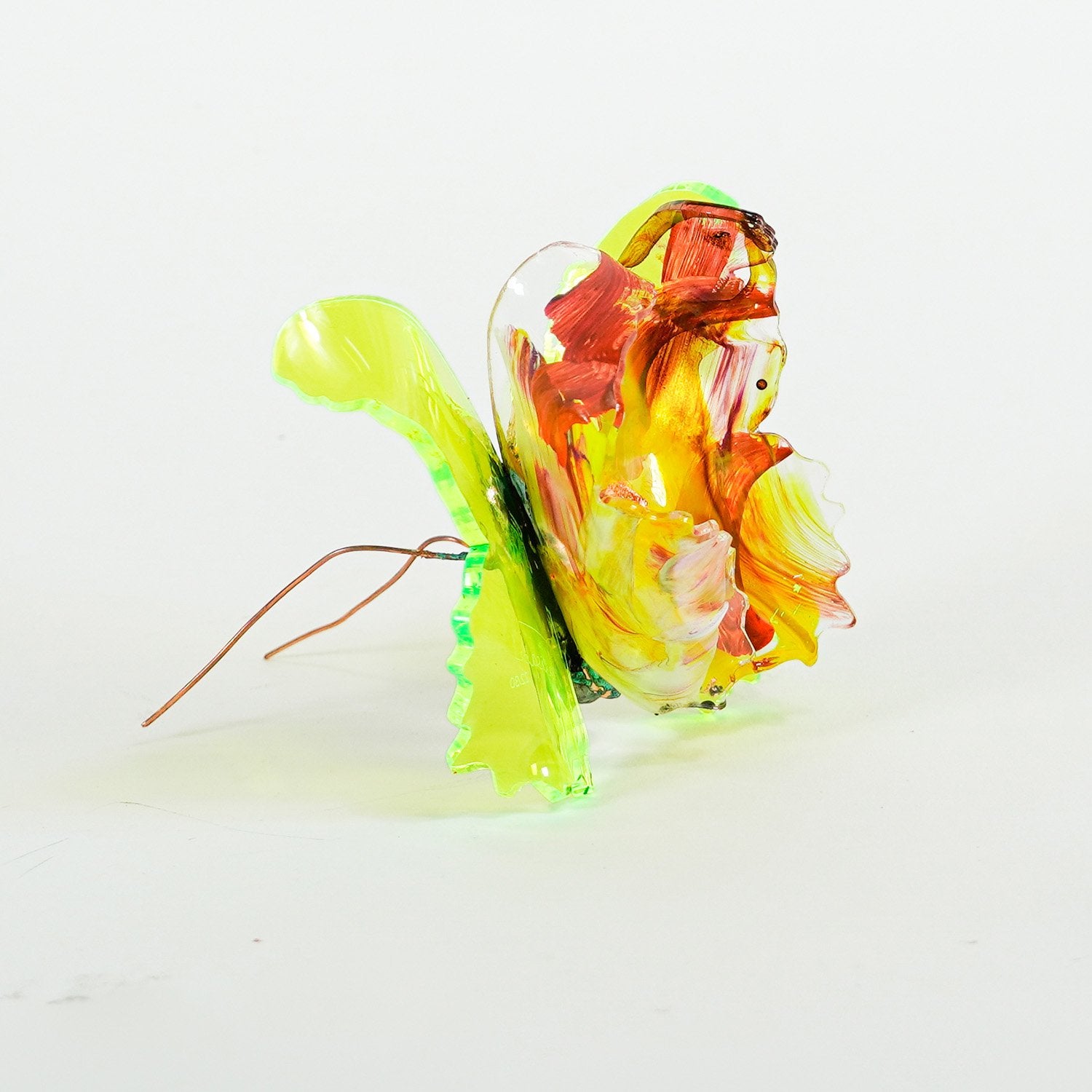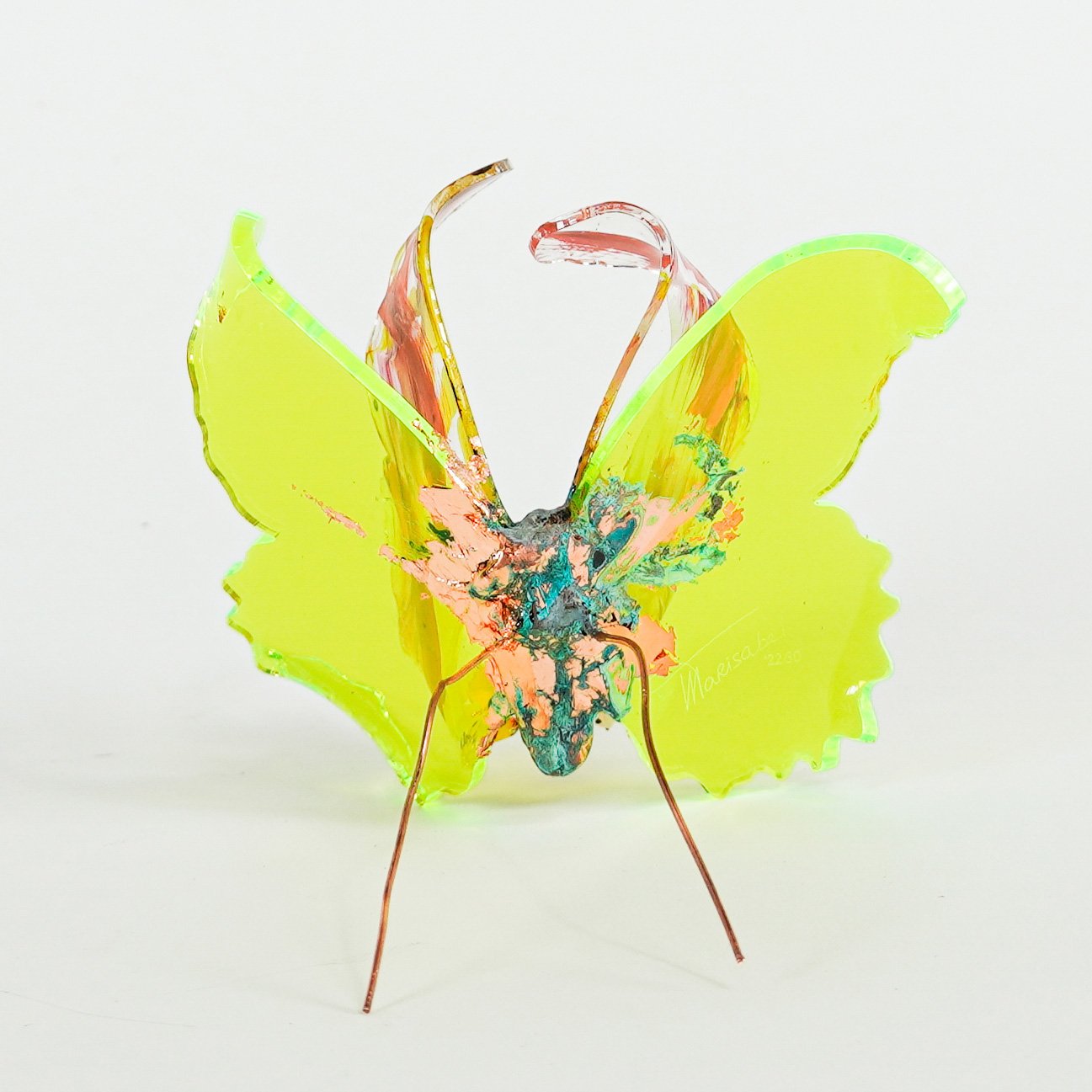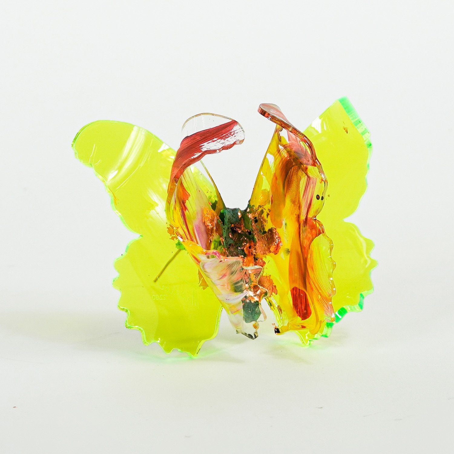 The Joy Holiday Collection - Ambar Edition is an annual series of one hundred handmade butterfly sculpture Christmas ornaments. Each piece is created from multiple layers of plexiglass, hand-painted, and bent to achieve the illusion of movement. For this limited edition, I have chosen to incorporate lime green neon-colored plexiglass and copper leaf.