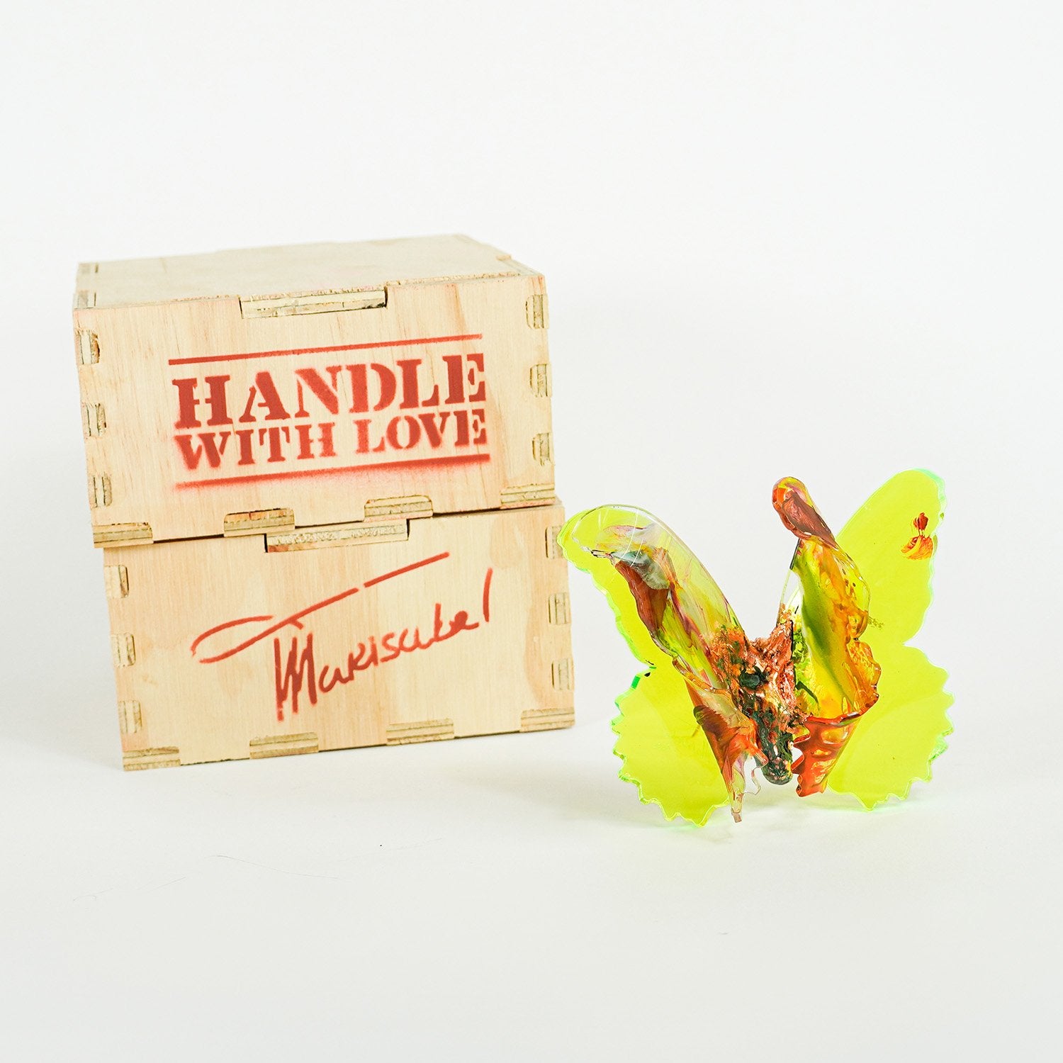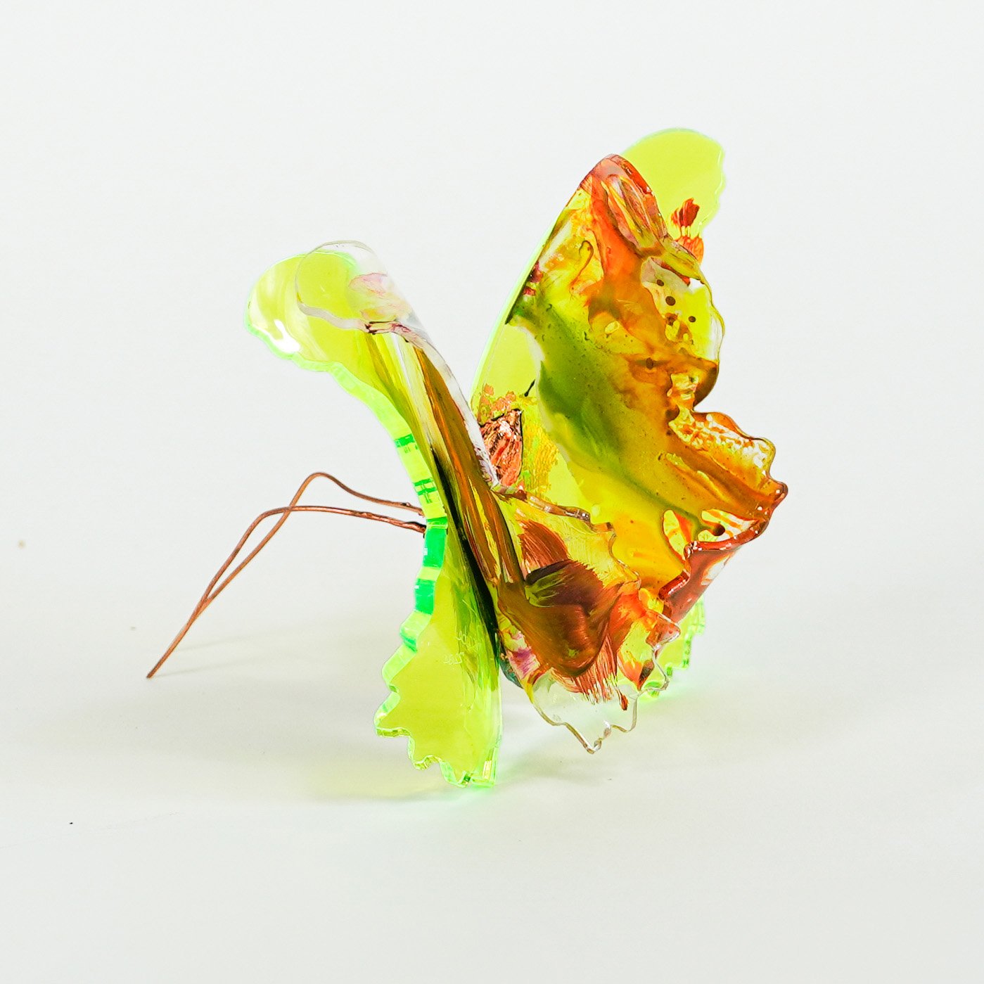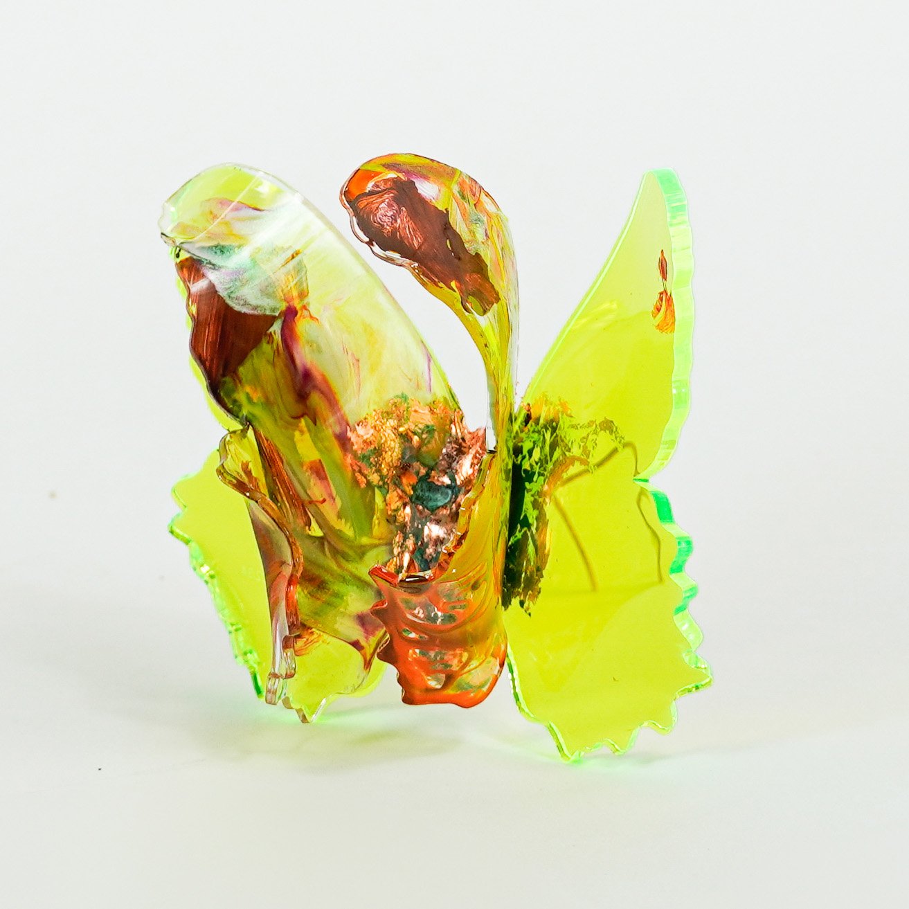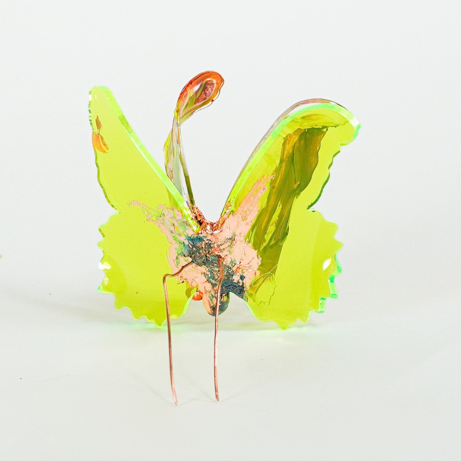 The Joy Holiday Collection - Ambar Edition is an annual series of one hundred handmade butterfly sculpture Christmas ornaments. Each piece is created from multiple layers of plexiglass, hand-painted, and bent to achieve the illusion of movement. For this limited edition, I have chosen to incorporate lime green neon-colored plexiglass and copper leaf.