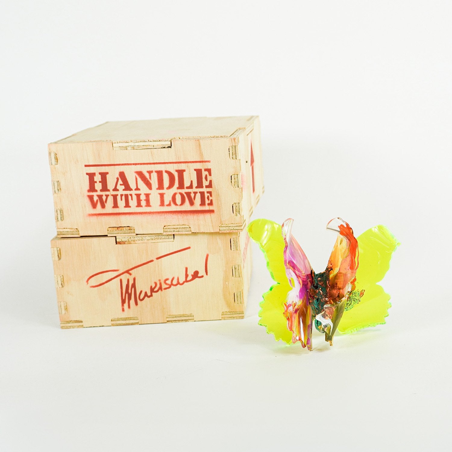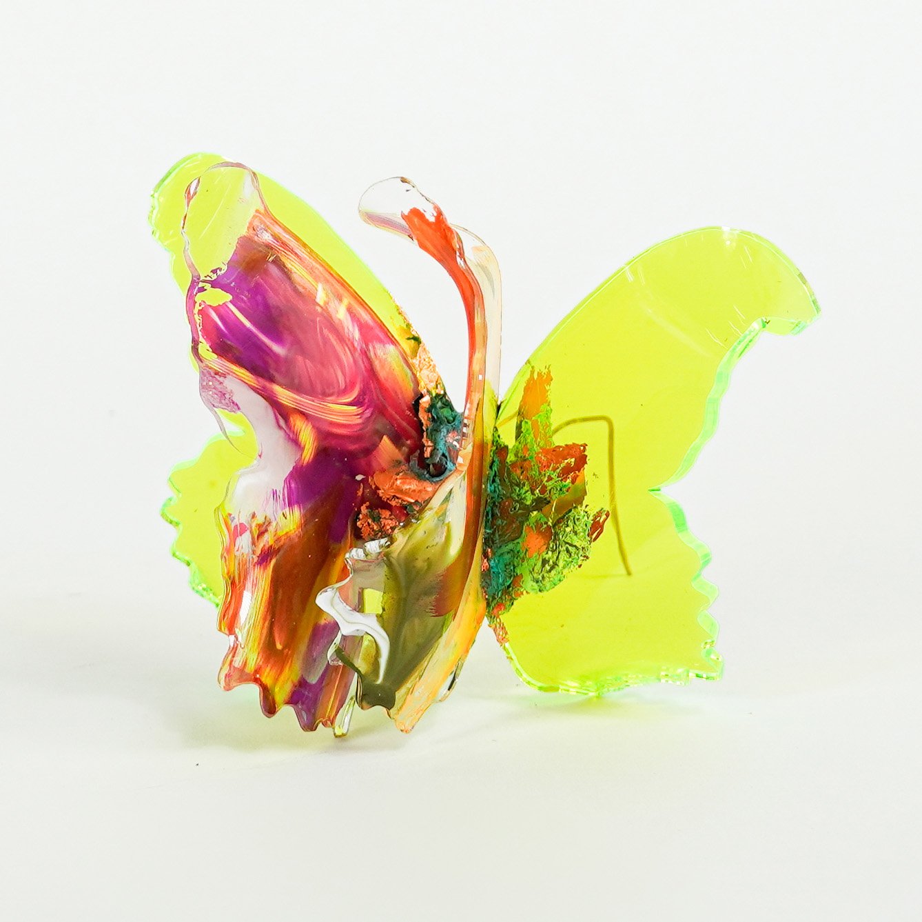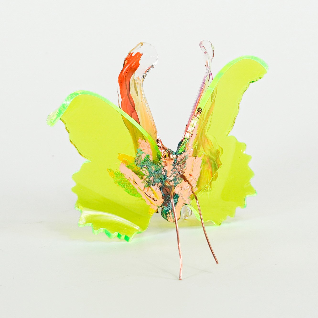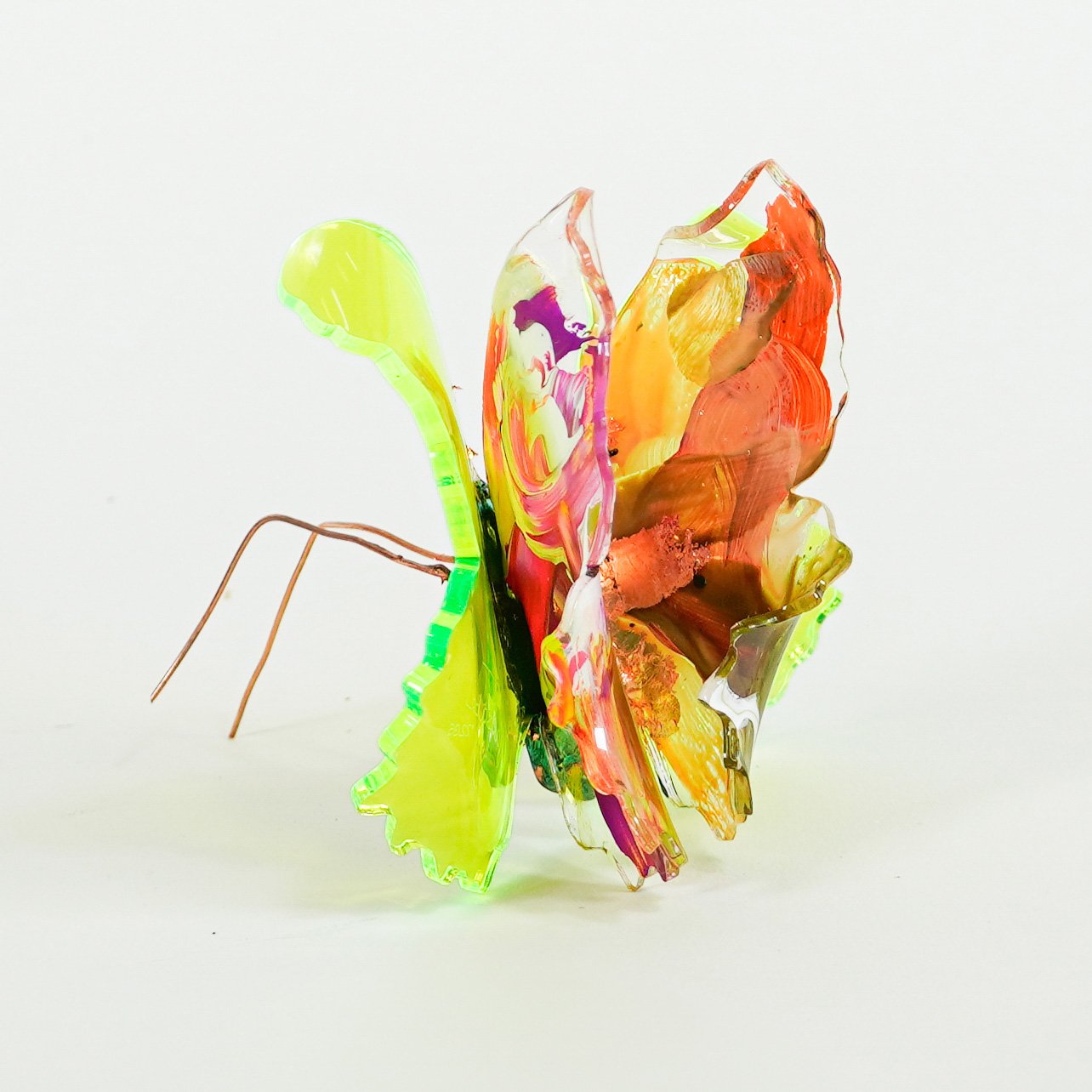 The Joy Holiday Collection - Ambar Edition is an annual series of one hundred handmade butterfly sculpture Christmas ornaments. Each piece is created from multiple layers of plexiglass, hand-painted, and bent to achieve the illusion of movement. For this limited edition, I have chosen to incorporate lime green neon-colored plexiglass and copper leaf.