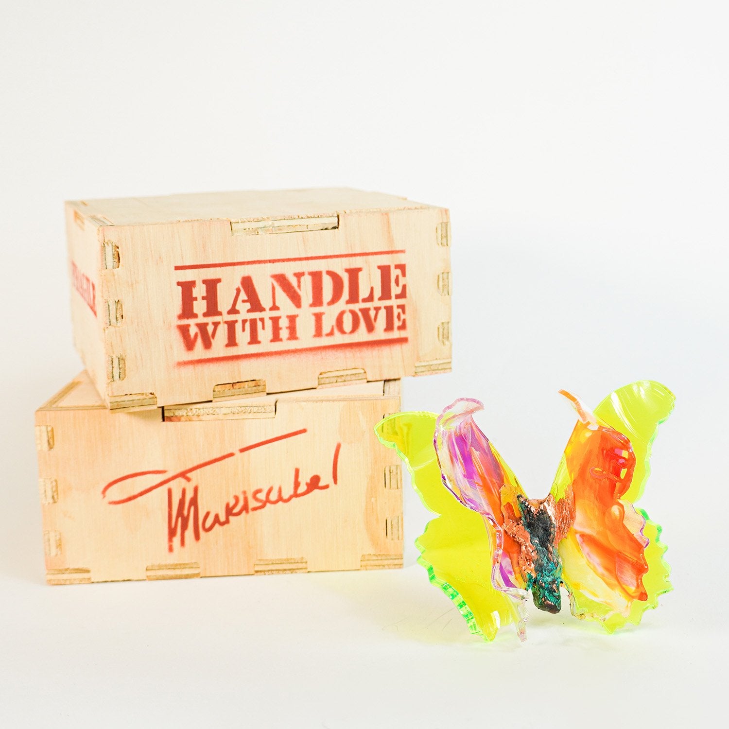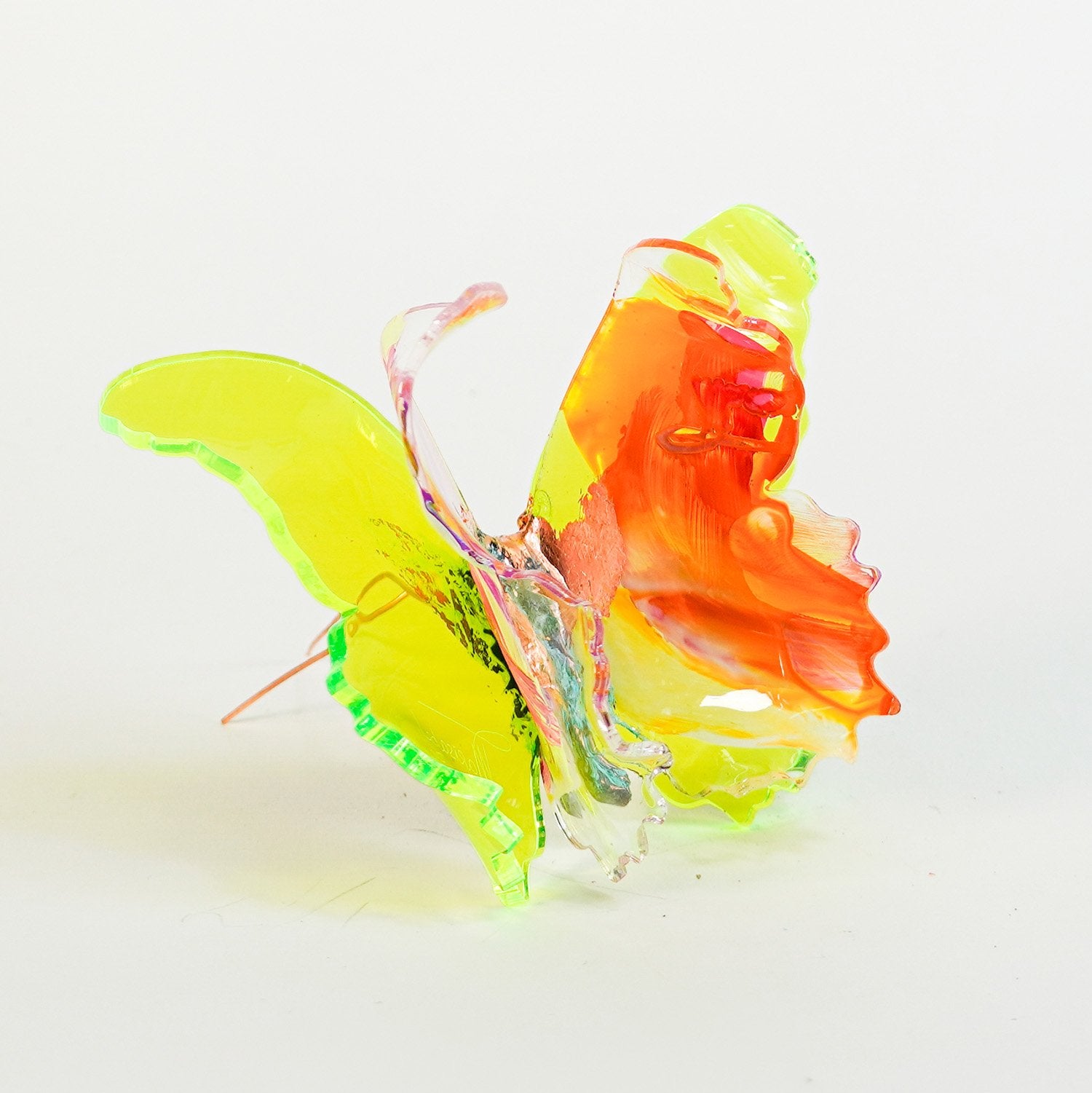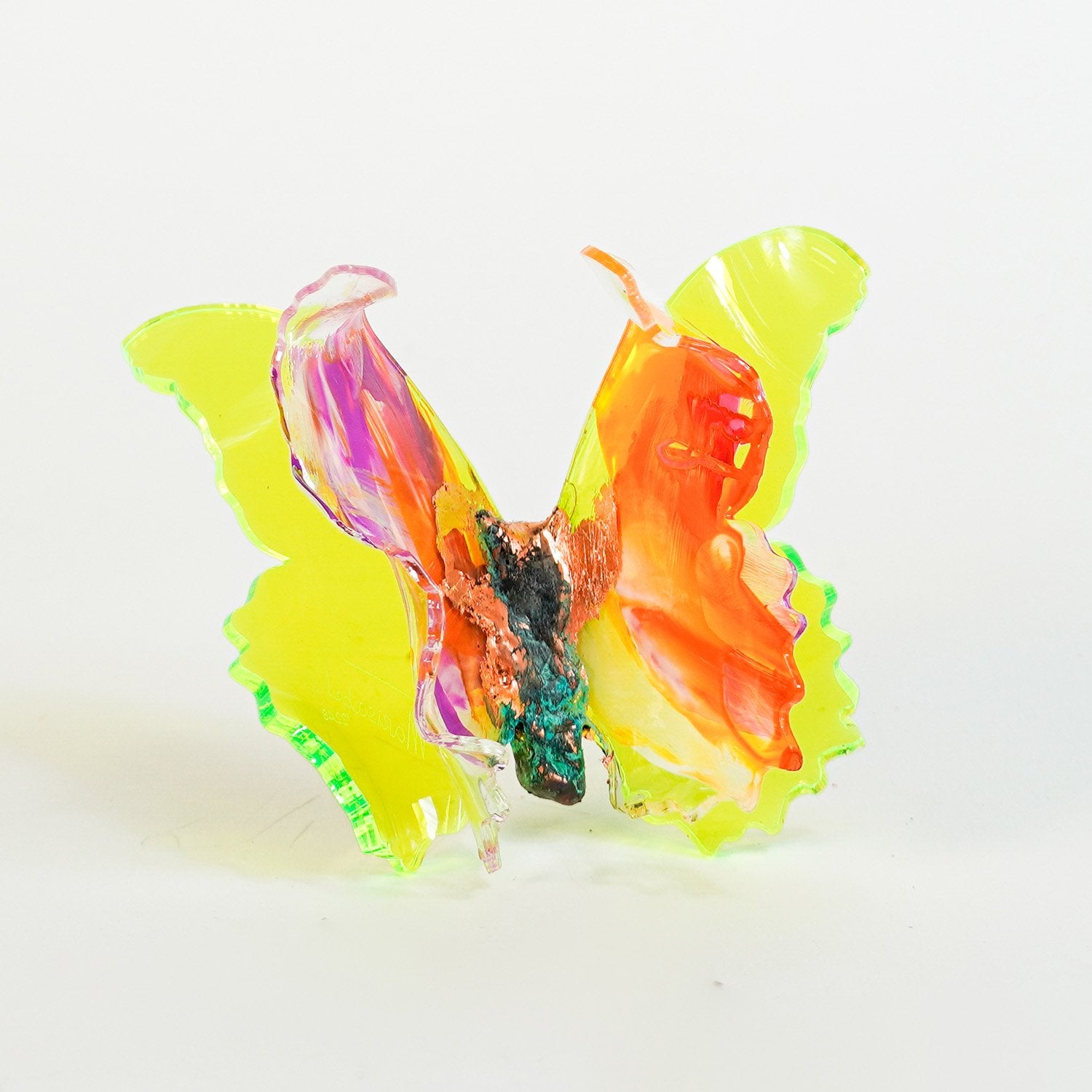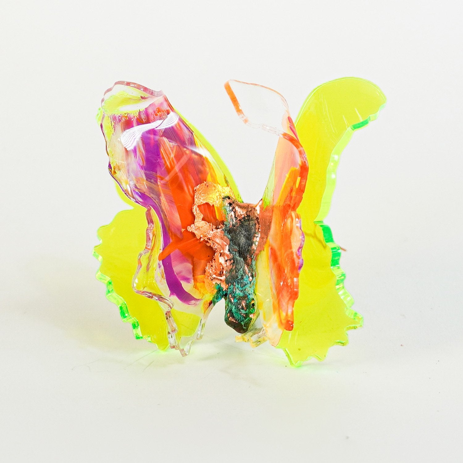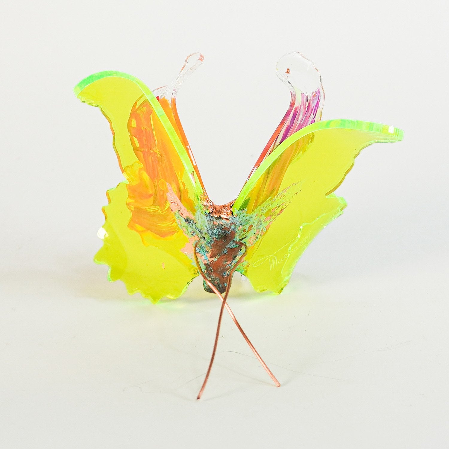 The Joy Holiday Collection - Ambar Edition is an annual series of one hundred handmade butterfly sculpture Christmas ornaments. Each piece is created from multiple layers of plexiglass, hand-painted, and bent to achieve the illusion of movement. For this limited edition, I have chosen to incorporate lime green neon-colored plexiglass and copper leaf.