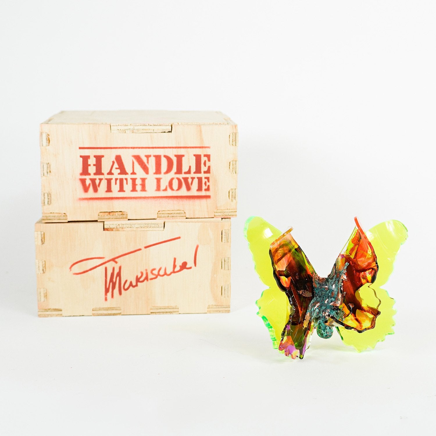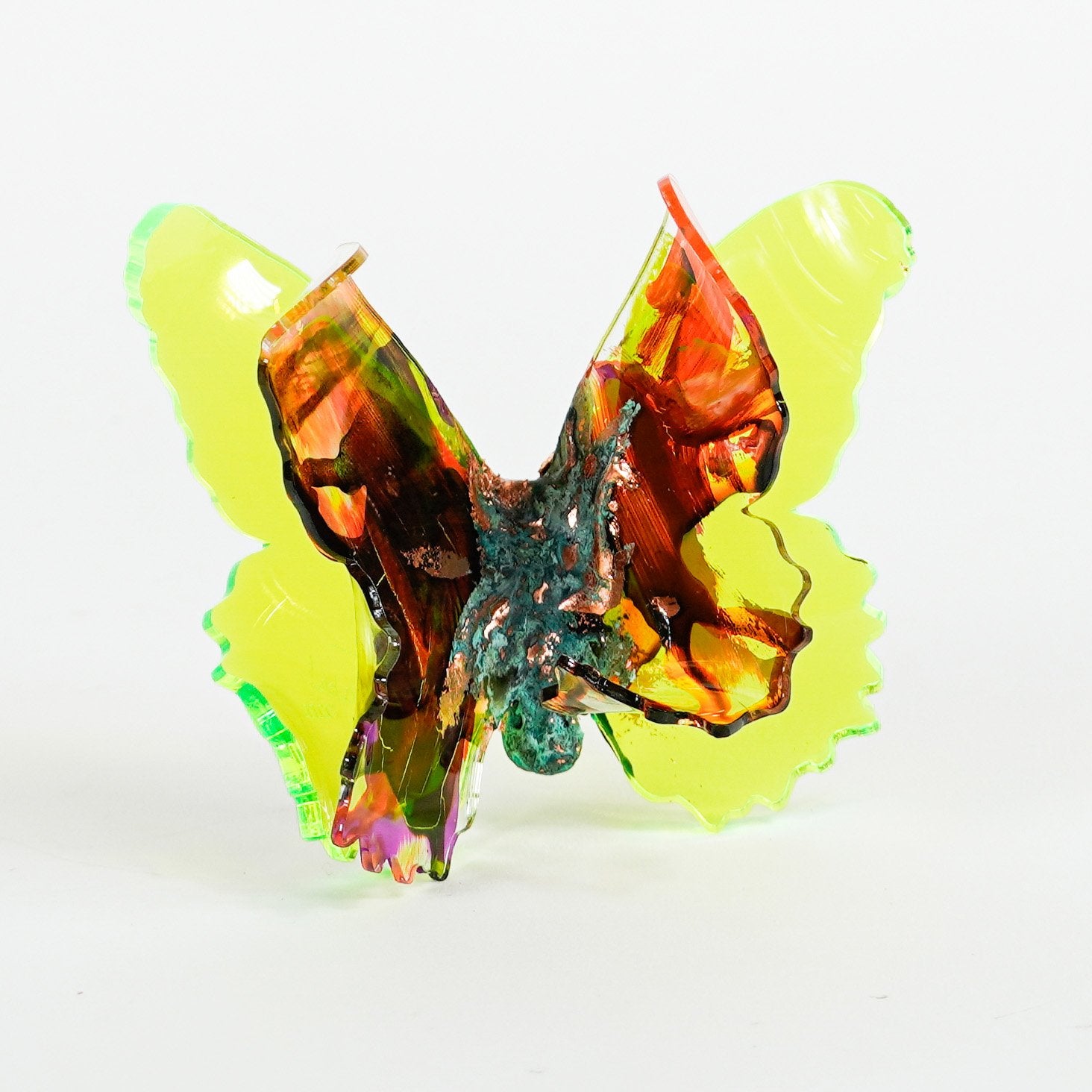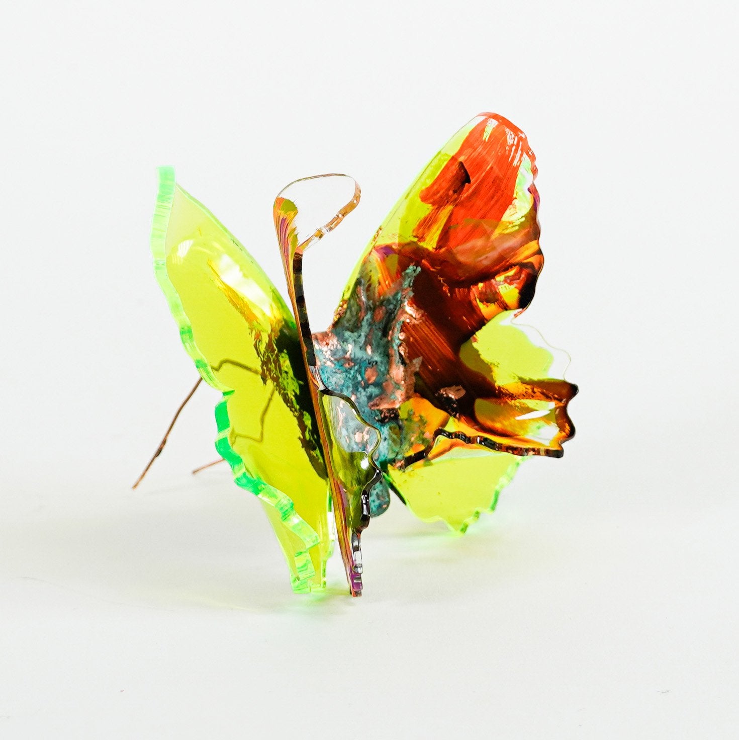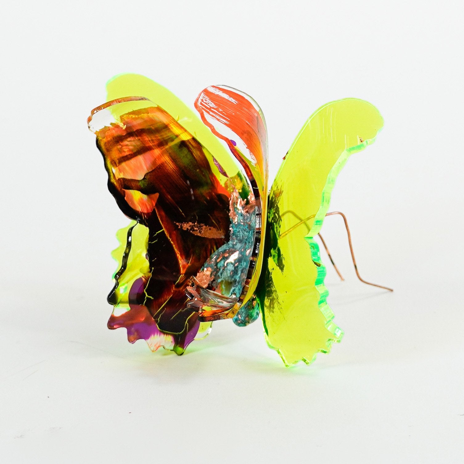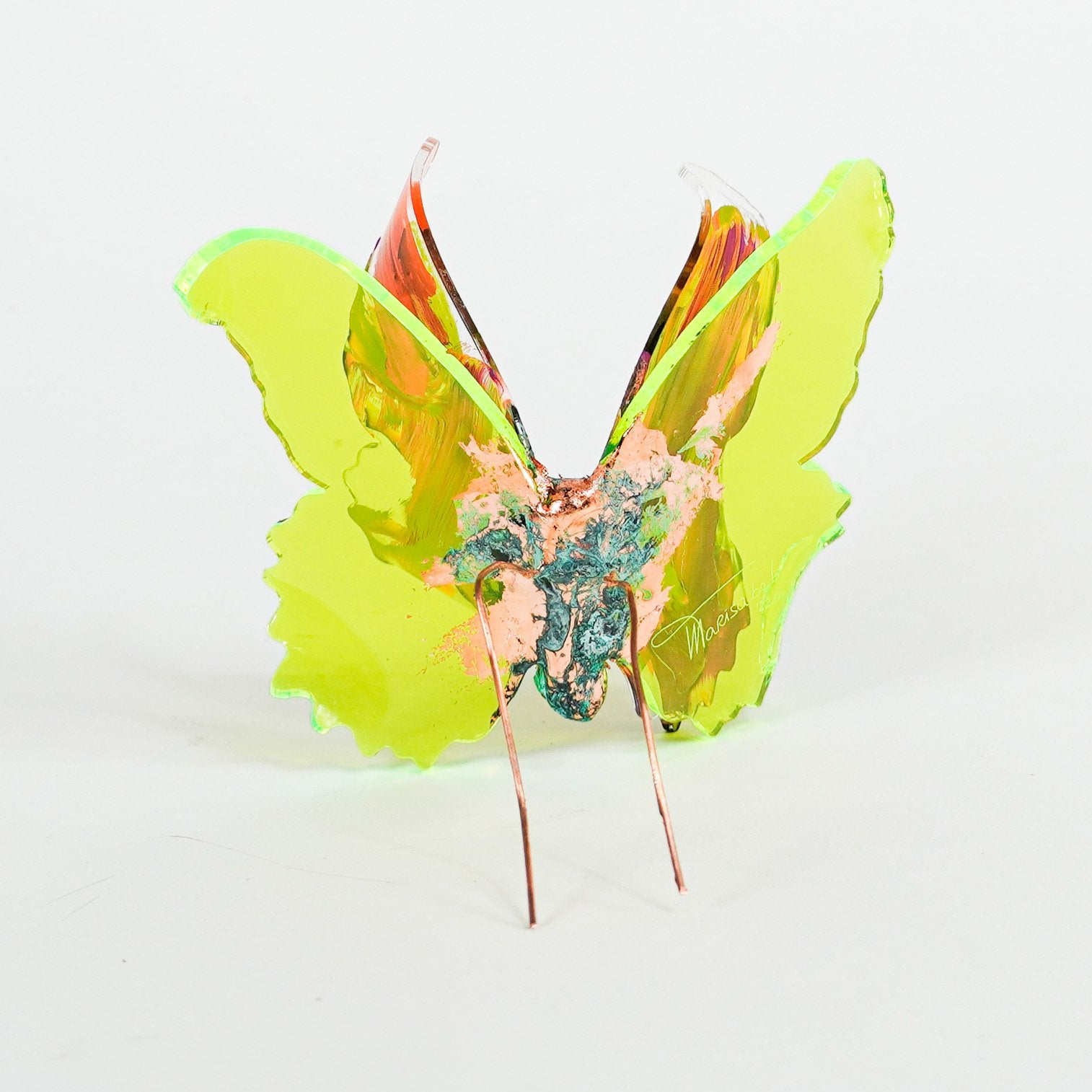 The Joy Holiday Collection - Ambar Edition is an annual series of one hundred handmade butterfly sculpture Christmas ornaments. Each piece is created from multiple layers of plexiglass, hand-painted, and bent to achieve the illusion of movement. For this limited edition, I have chosen to incorporate lime green neon-colored plexiglass and copper leaf.