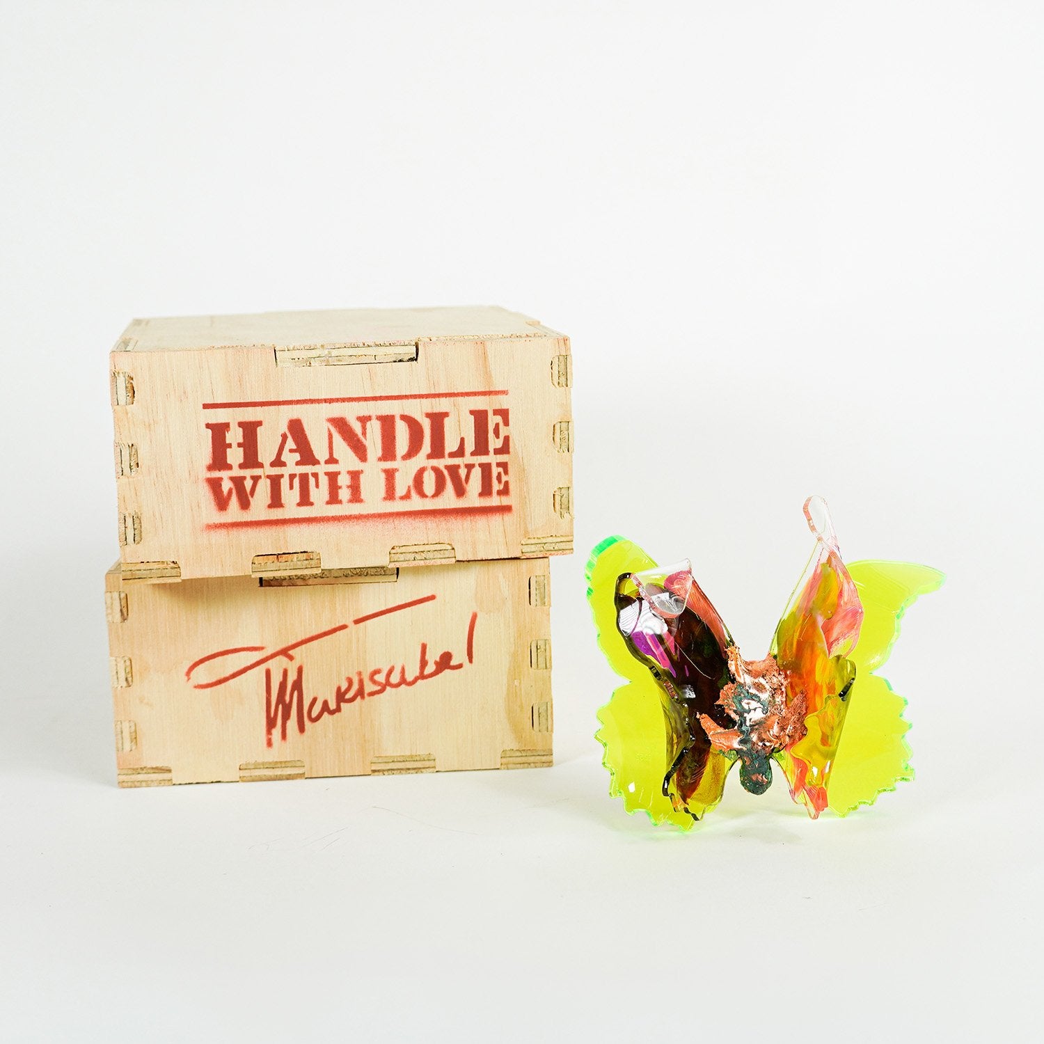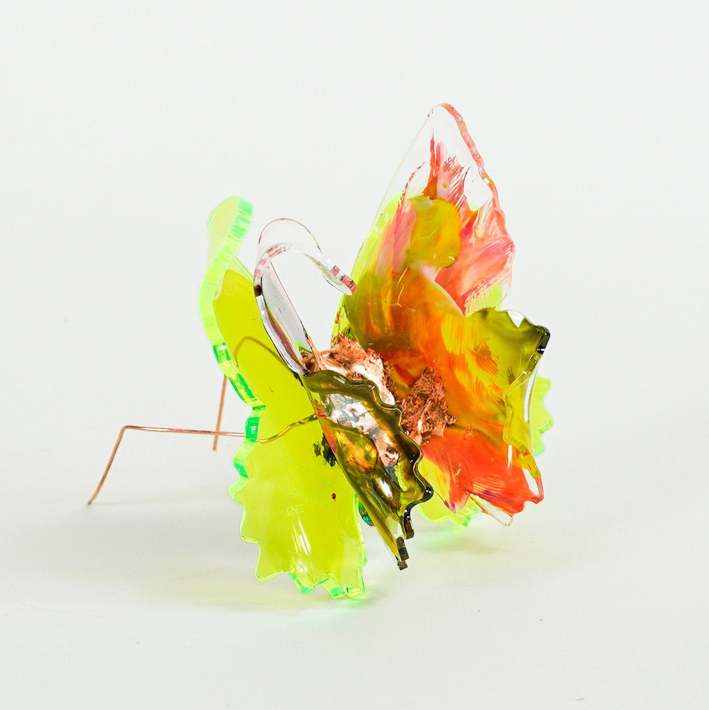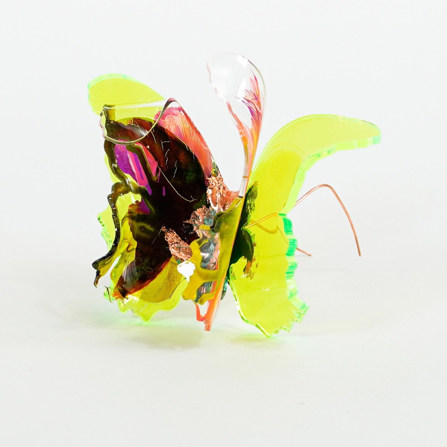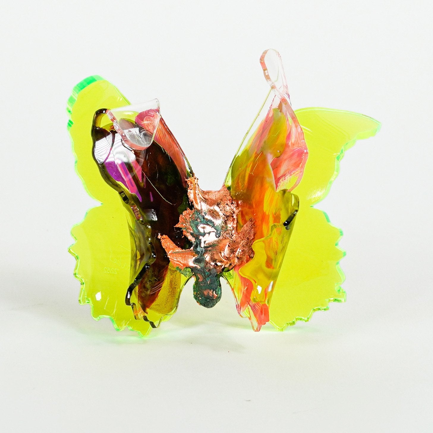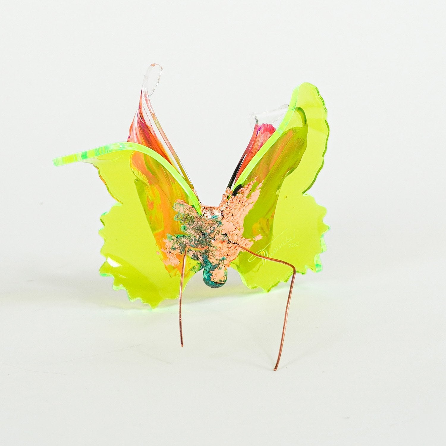 The Joy Holiday Collection - Ambar Edition is an annual series of one hundred handmade butterfly sculpture Christmas ornaments. Each piece is created from multiple layers of plexiglass, hand-painted, and bent to achieve the illusion of movement. For this limited edition, I have chosen to incorporate lime green neon-colored plexiglass and copper leaf.