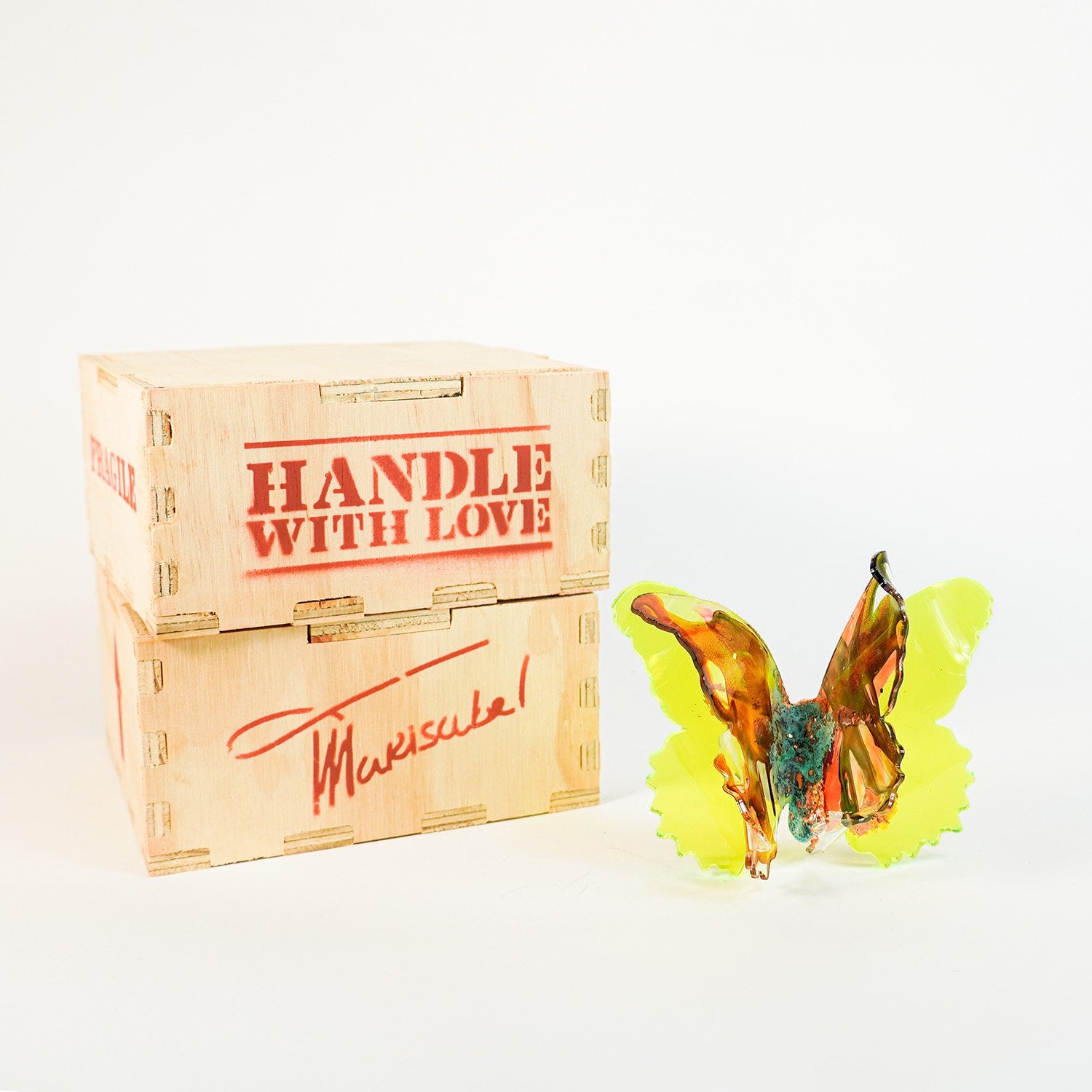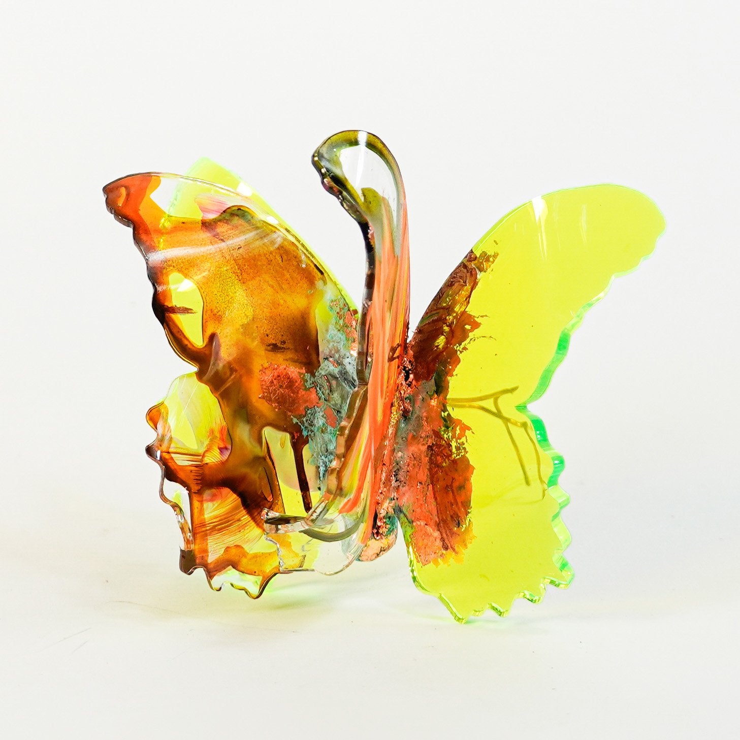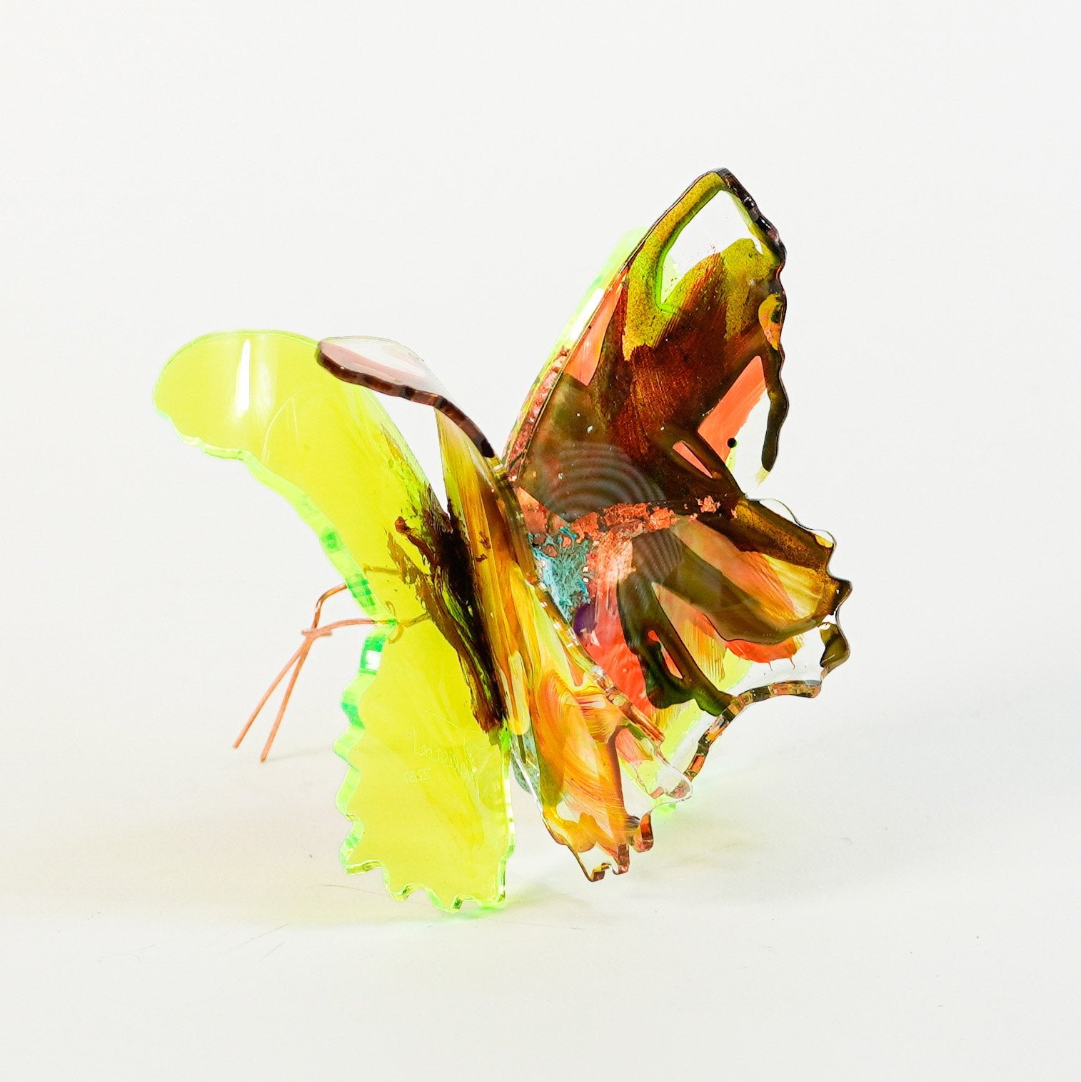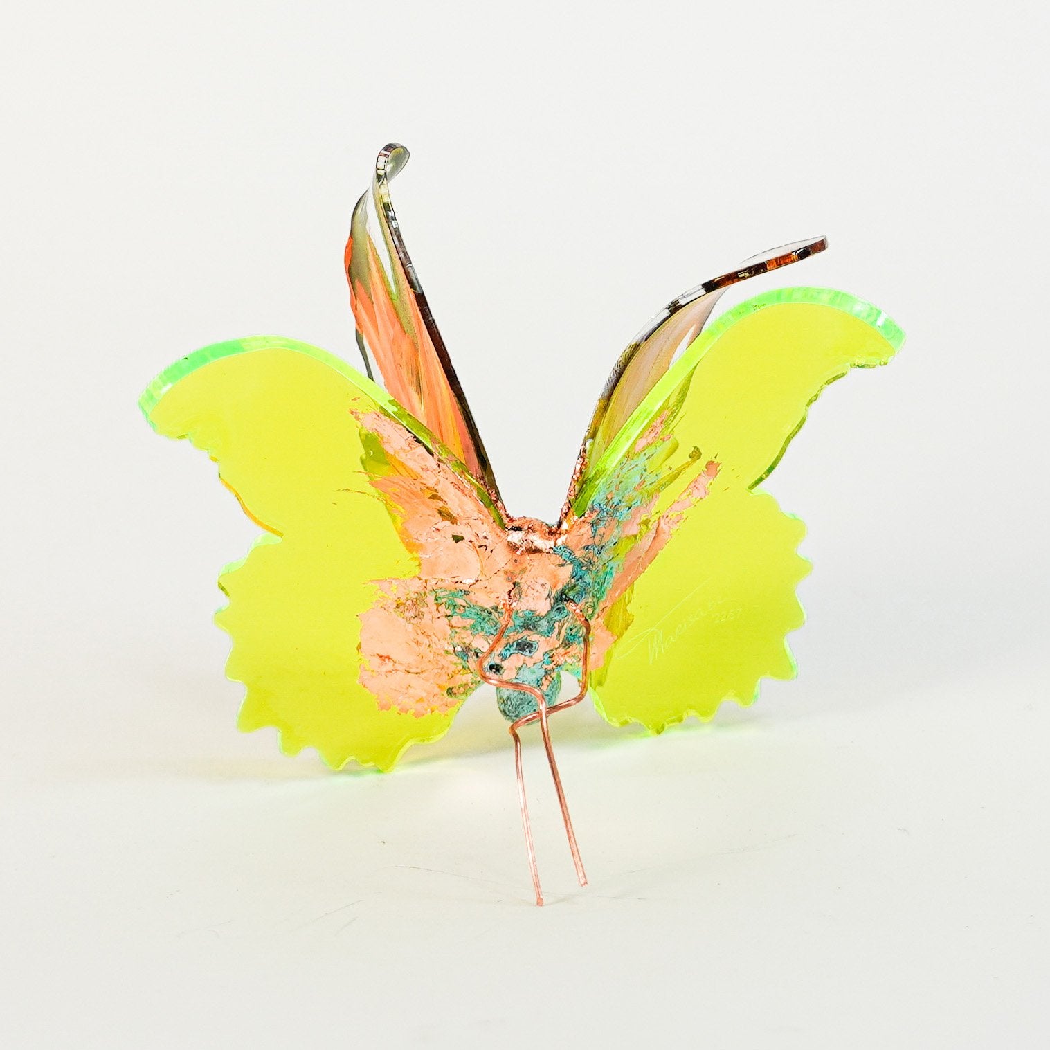 The Joy Holiday Collection - Ambar Edition is an annual series of one hundred handmade butterfly sculpture Christmas ornaments. Each piece is created from multiple layers of plexiglass, hand-painted, and bent to achieve the illusion of movement. For this limited edition, I have chosen to incorporate lime green neon-colored plexiglass and copper leaf.